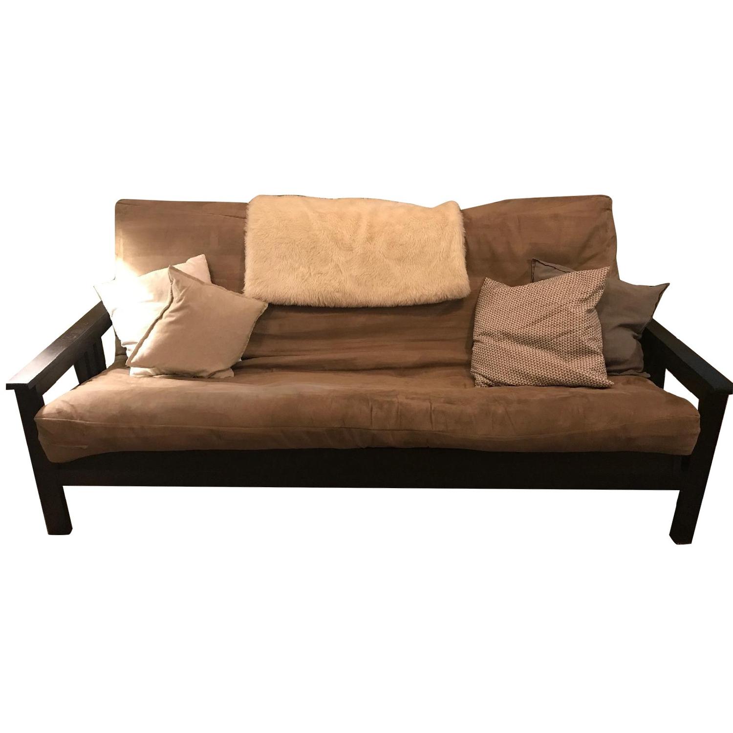 Seller's Notes:Sturdy futon hardwood futon frame with 6" futon pad and tan microsuede cover. Frame has some scratches/dings, but nothing major or easily discernable. Comfortable futon with hypoallergenic stuffing and a foam core -- comfy as a couch or guest bed! Owned two years, I'm just upsizing.