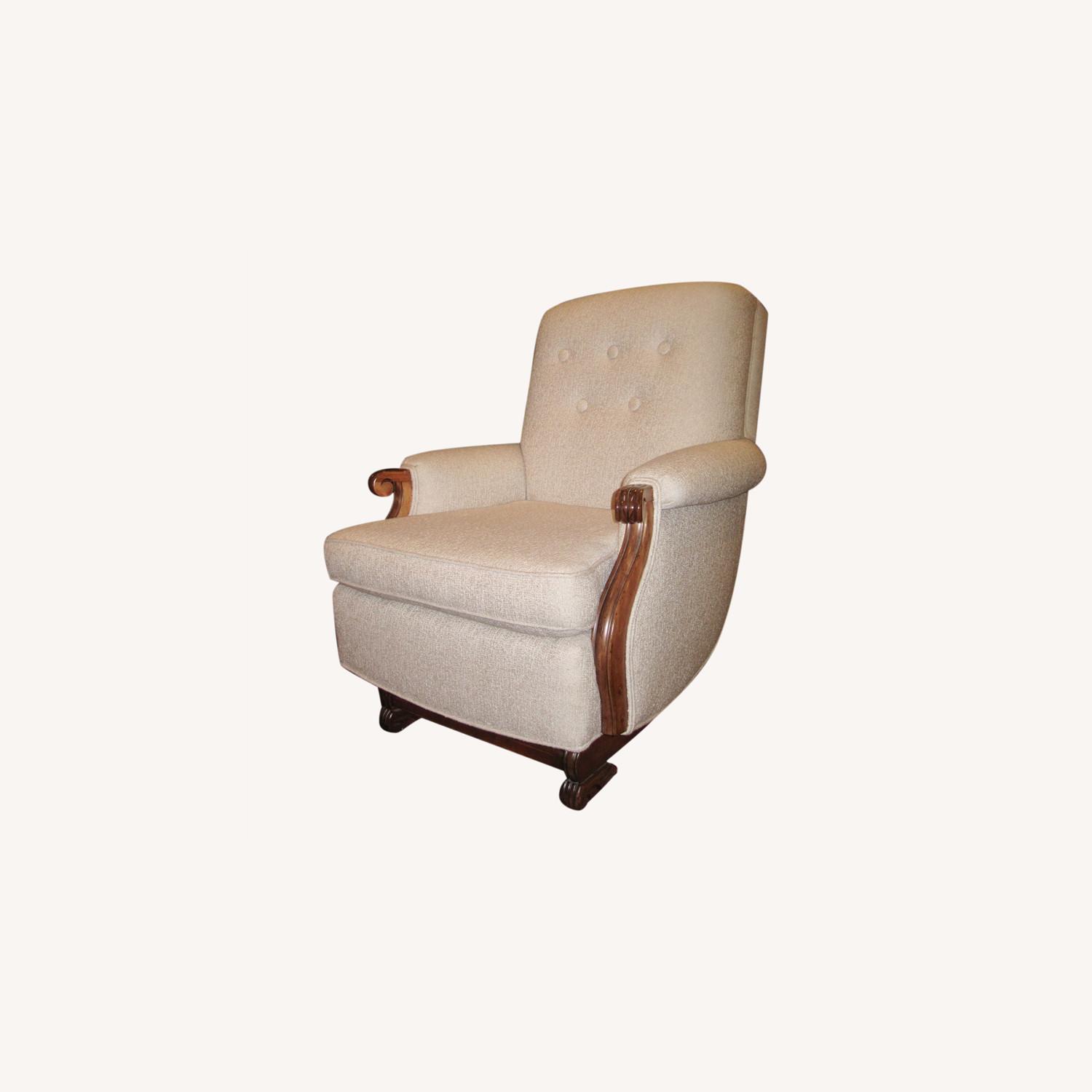 Seller's Notes:Kroehler Manufacturing Company Platform Rocker Stunning MidCentury Modern cottage style with elegant curved back, lodge style carved arm and platform base Newly upholstered Sunbrella Indoor/Outdoor Essentials Upholstery in Color "Linen" Double and single welt cording. Fabric is a perfect complement to the carved arm, side and base. Texture reflects a midcentury cottage style. Five button tufted back Walnut color hardwood Height: approx. 36" Width: approx. 31" Depth: approx. 36" Seat depth: approx. 22" Manufactured from 1940-50's by the Kroehler Manufacturing Company. The Kroehler Manufacturing Company was a furniture company founded in the late-nineteenth century and based in Naperville, Illinois Excellent Condition, no rips, tears, or stains.