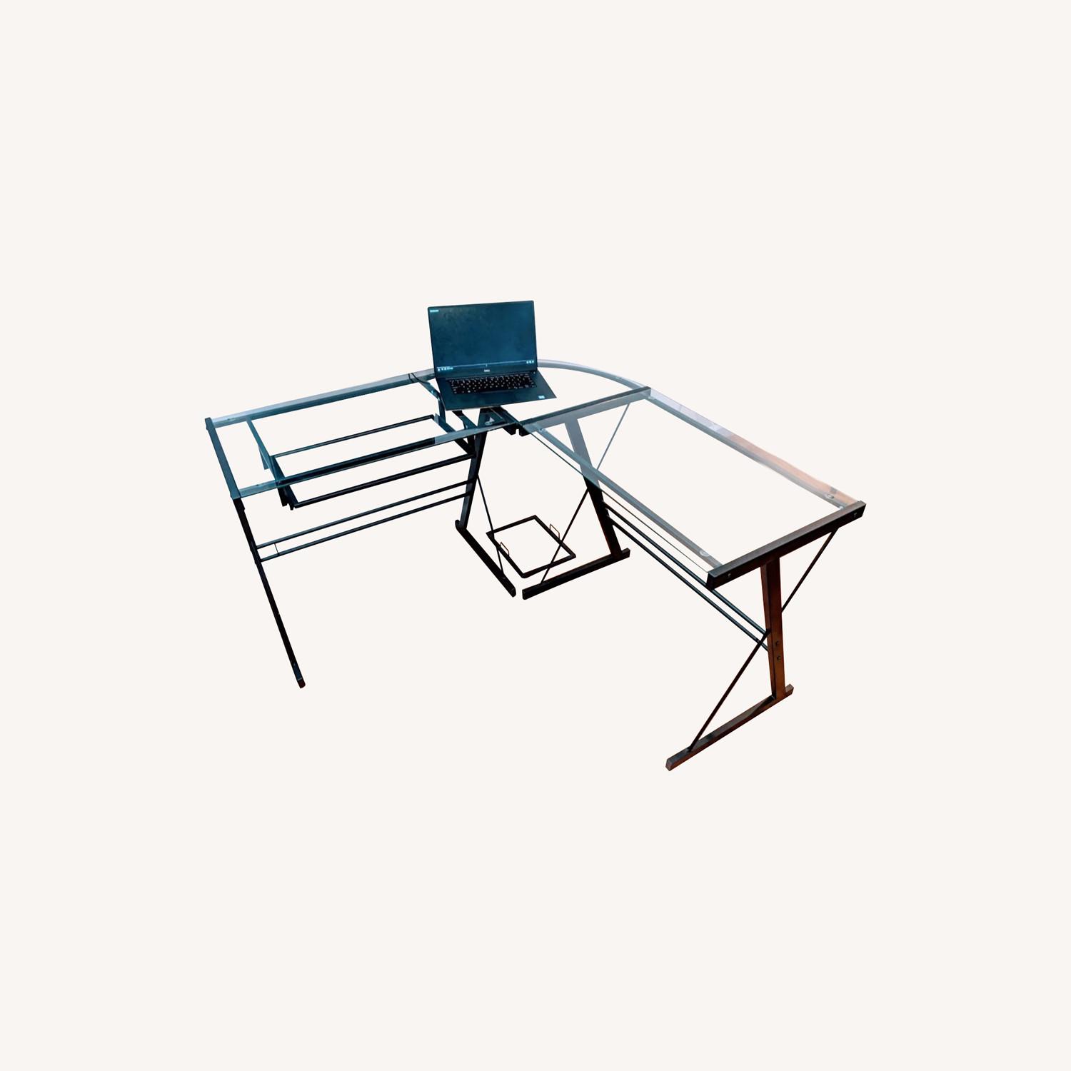 Seller's Notes:This modern desk perched on a steel frame is fantastic for a remote job, attending school remotely, or gaming. It is also ideal for those who need additional space for an extra monitor, books, or other types of assorted office supplies. Complete with safety glass and a slide-out keyboard tray, this desk is able to be configured into various shapes to suit the buyer's needs. Tower stand included (as shown in picture). Computers are not included.