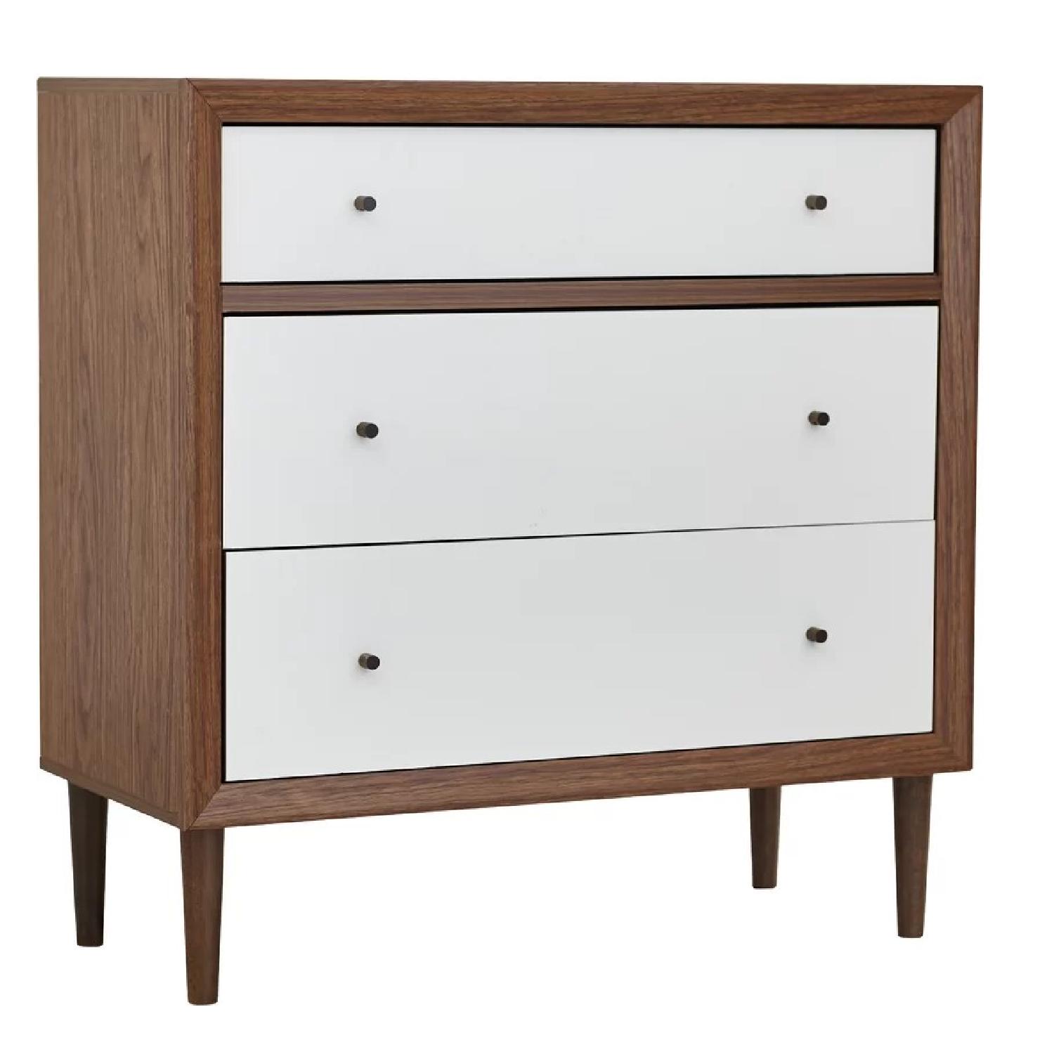 Seller's Notes:-Slender and streamlined, 3-door Chest -Two large drawers offer ample stowaway space, and a slimmed-down top drawer provides an effortless home for petite keepsakes. -Smooth drawer runner -Wooden knobs -Color: white and walnut -Material: Wood -Chip in posterior left corner that could easily be covered by lamp, book, or decor/put next to wall.