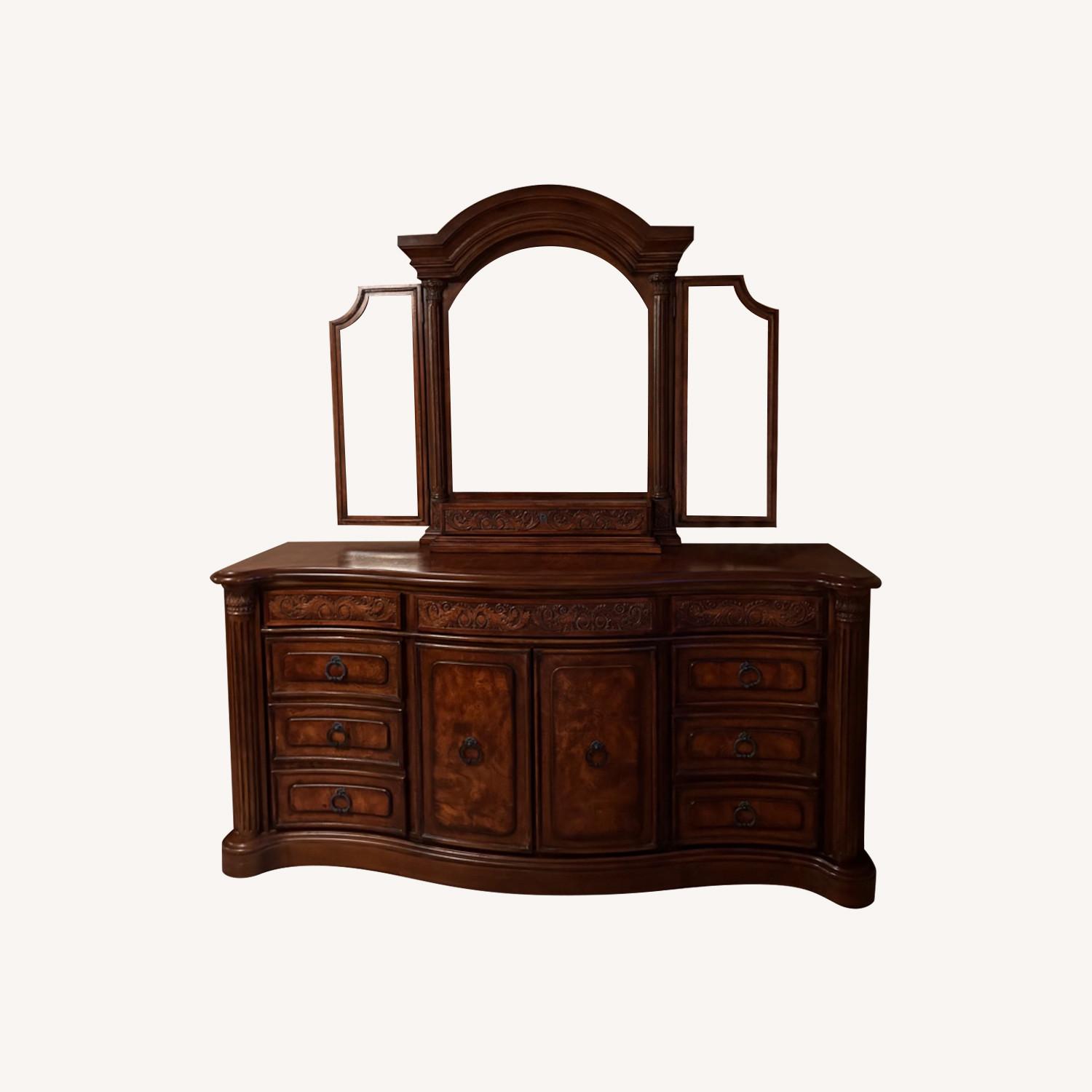 Seller's Notes:Beautifully carved wood dresser with mirror. Mirror adds 49 inches of height Retails at $1800. See matching bed and nightstands