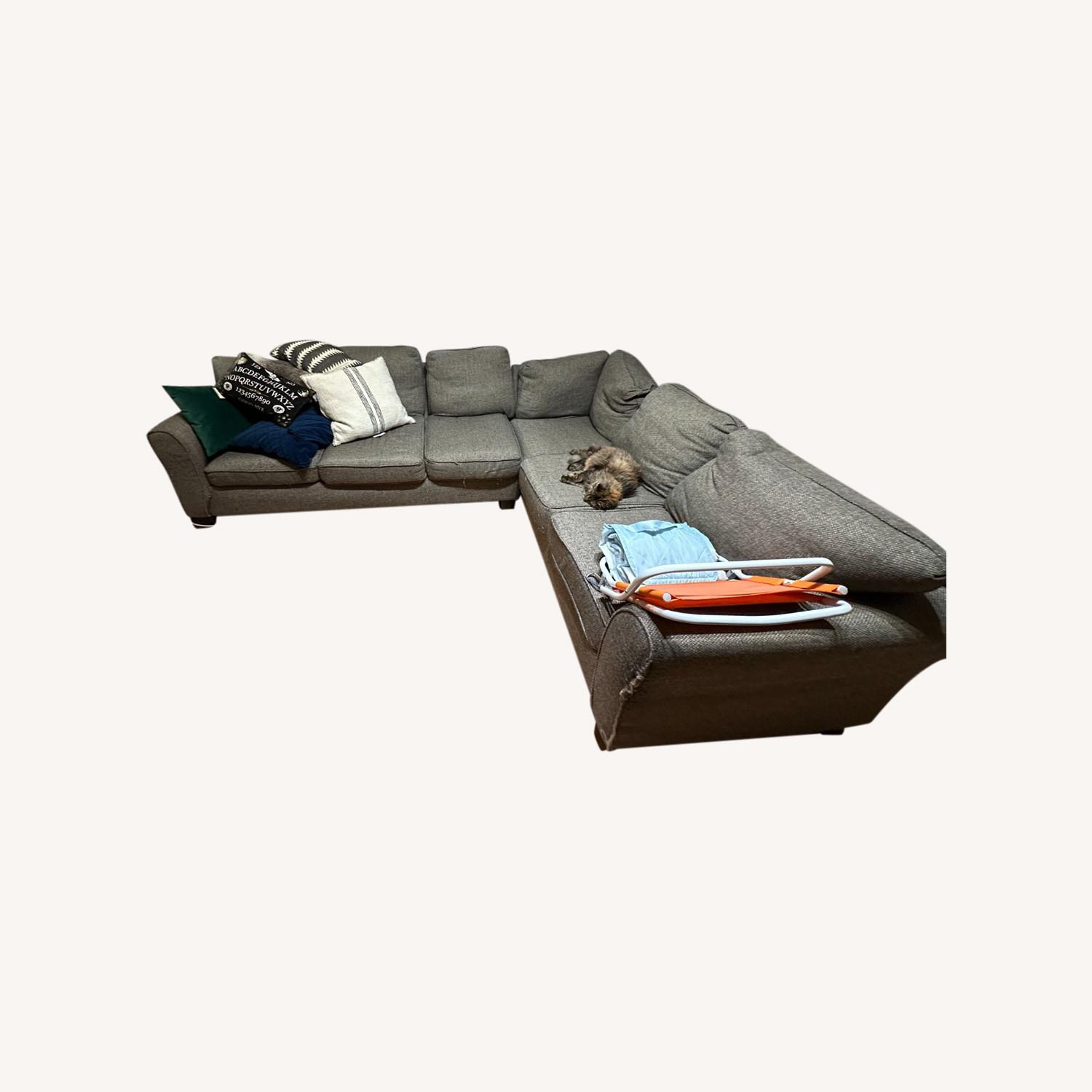 Seller's Notes:Large comfortable sectional! Has some cat scratch damage on the arm (pictured) but it's very comfortable and can seat 6 or sleep 2. I don't know the brand, I bought it at Gardner White in Michigan in 2017. I'm actually very sad to be parting with it, just won't fit in my new place! I think it has several good years left in it. Coming from a cat home just fyi!