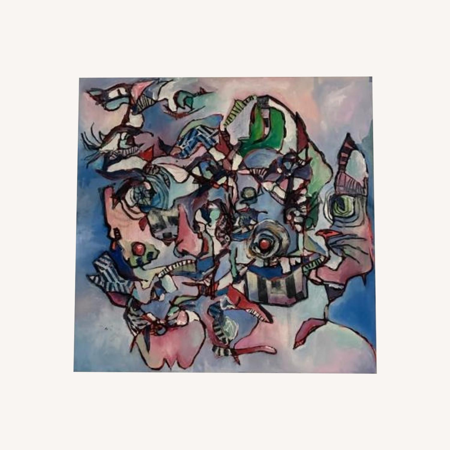 Seller's Notes:Large Abstract Oil Painting. Colorful painting on wooden canvas. Pastel colors with mostly blue and pink hues.