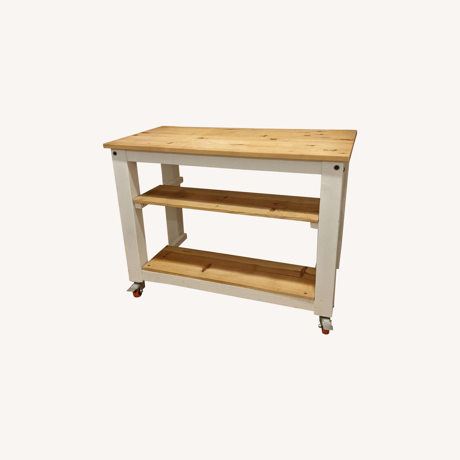 Seller's Notes:Solid Wood kitchen island with butcher's block top on rolling casters. Wood top with two additional wood shelves beneath. Wood has natural finish. Casters can be locked in place. Purchased on Etsy a few years ago, but we've since moved and it no longer fits in our space. Super high quality, can put barstools underneath on one side. Would be fantastic as a kitchen island, work table, rolling desk. Excellent used condition, has some fading and scuffs that could be wiped off.