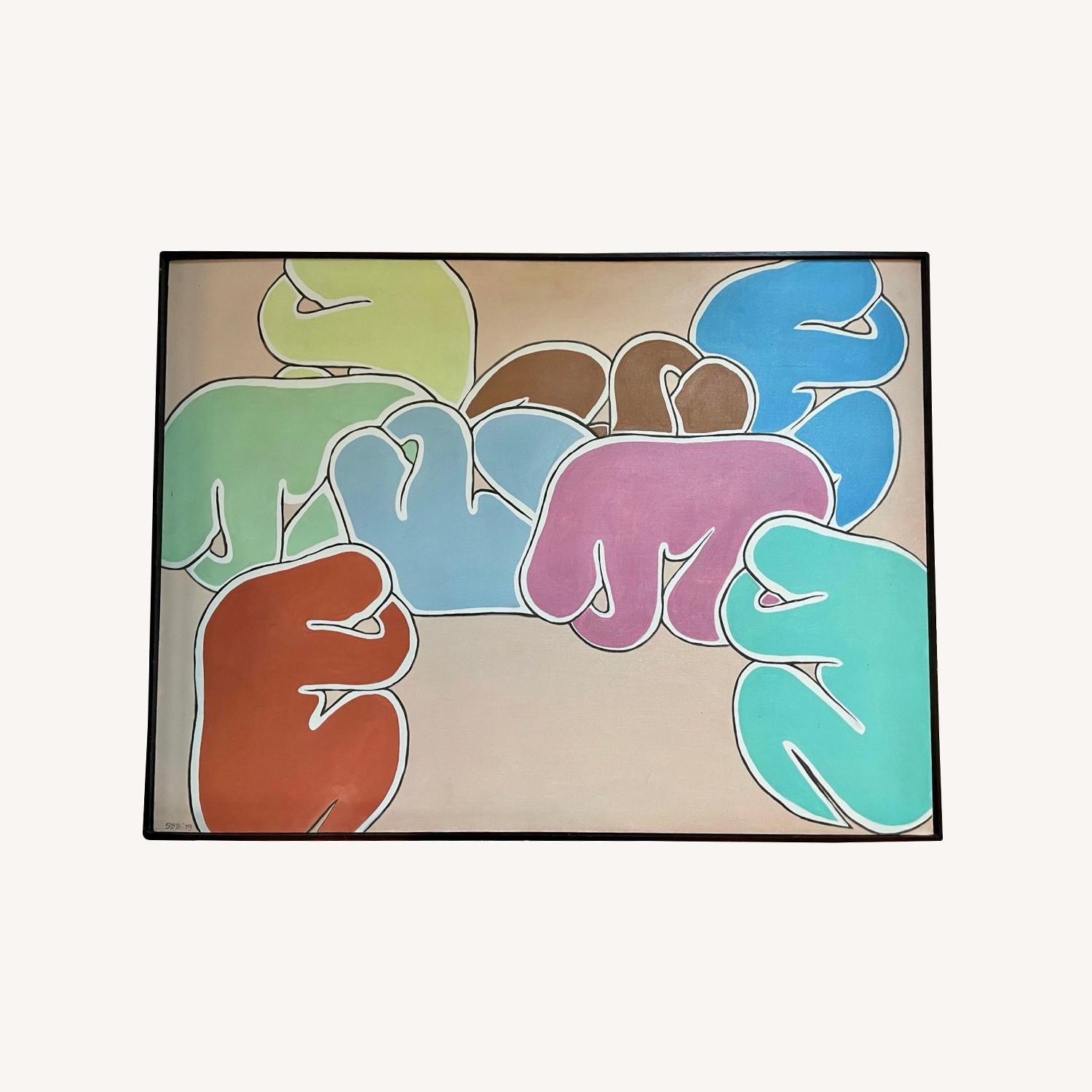 Seller's Notes:1979 large, colorful abstract painting, oil on canvass by Sharon Bond Brown. 30" H x 40" W w/o frame. 40.75" w x 30.5" H with Frame. Signed.