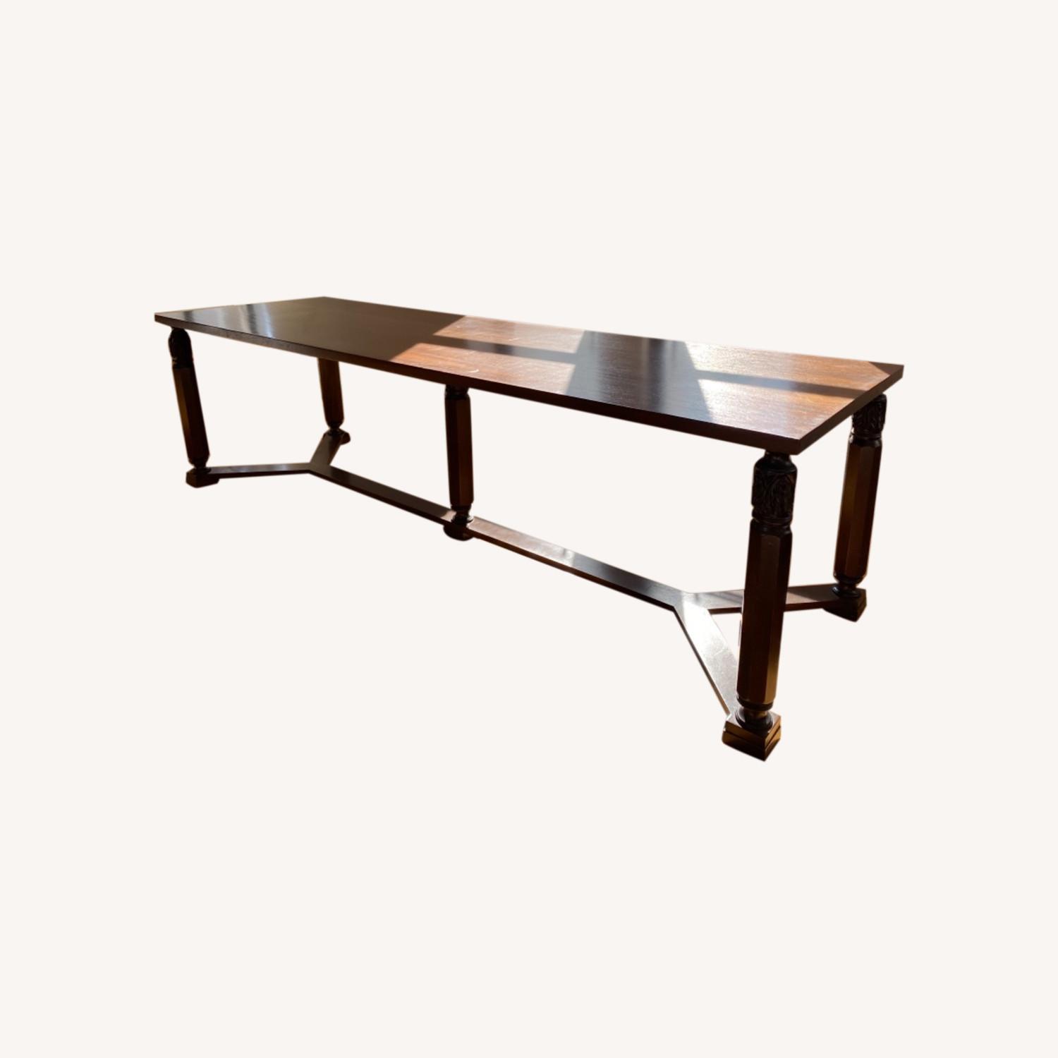 Seller's Notes:Beautiful wood custom dining table created by our interior designer. Table comfortably seats 8. We have enjoyed years of family dinners around this table. Some wear and tear including scratches and discoloration in a few places (shown in pictures). Will need to be disassembled to remove (can be done simply with a drill by movers). We have a set of 6 chairs which we would include if desired (they have some wear and tear but are beautiful and comfortable).