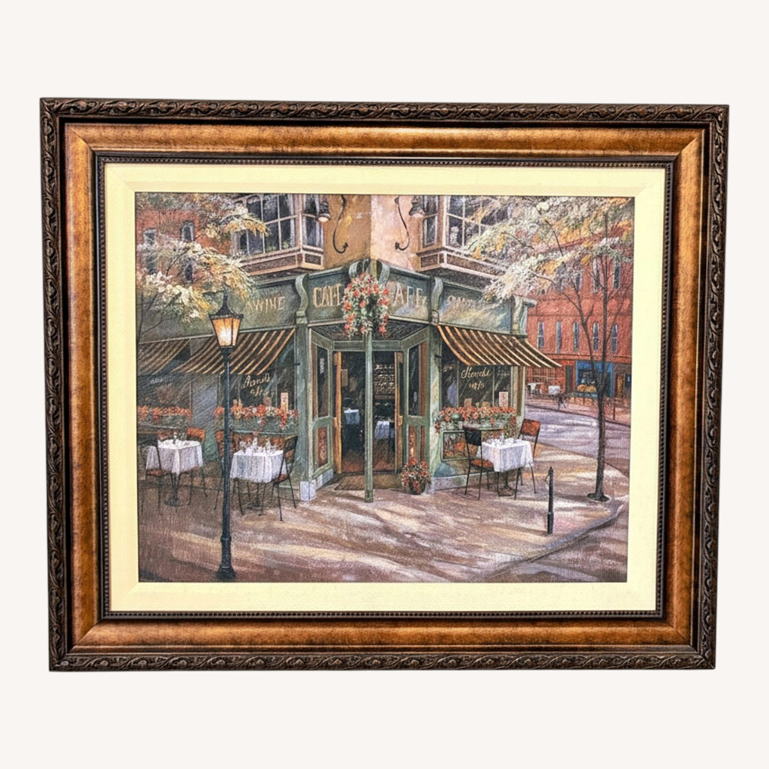 Seller's Notes:Large Framed “Mandis Cafe” Wall Art Beautiful Paris café scene print by Ruane Manning. Features a cozy street corner café with outdoor tables, warm colors, and flowers. Comes in a large, solid frame with a classic, detailed design. Details: - Title: Mandis Cafe - Artist: Ruane Manning - Large-sized wall art - Thick, decorative frame