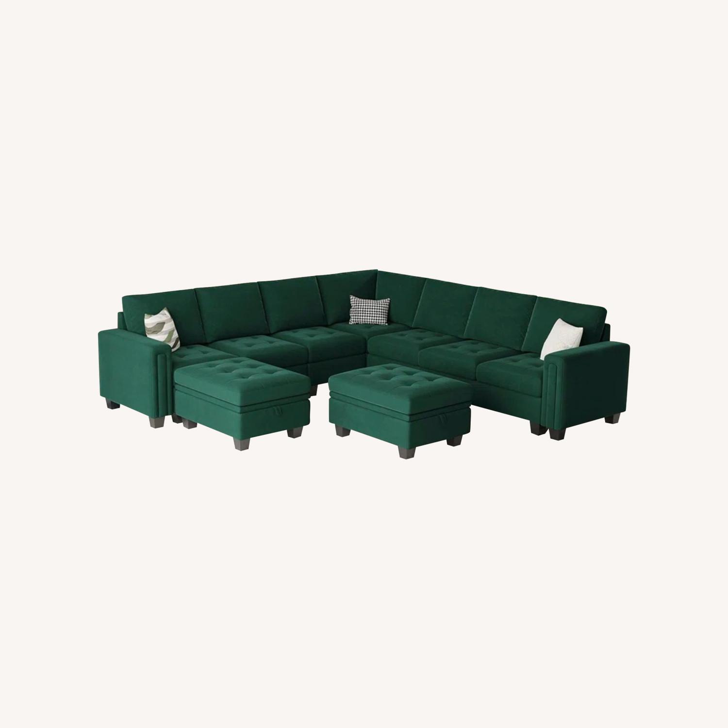 Seller's Notes:For sale, large and comfortable green velvet sectional sofa.