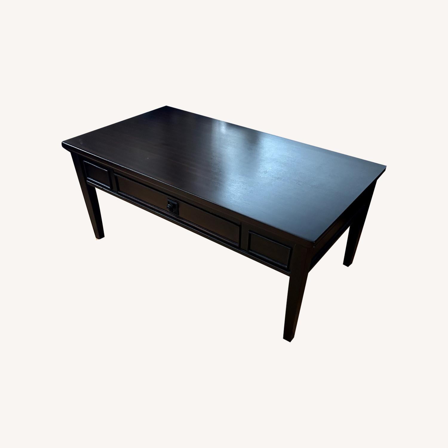 Seller's Notes:Large rectangle dark brown wood coffee table with one storage drawer. It was purchased new 10 years ago. Light scratching on top but only visible in bright sunlight. Otherwise in very good shape.
