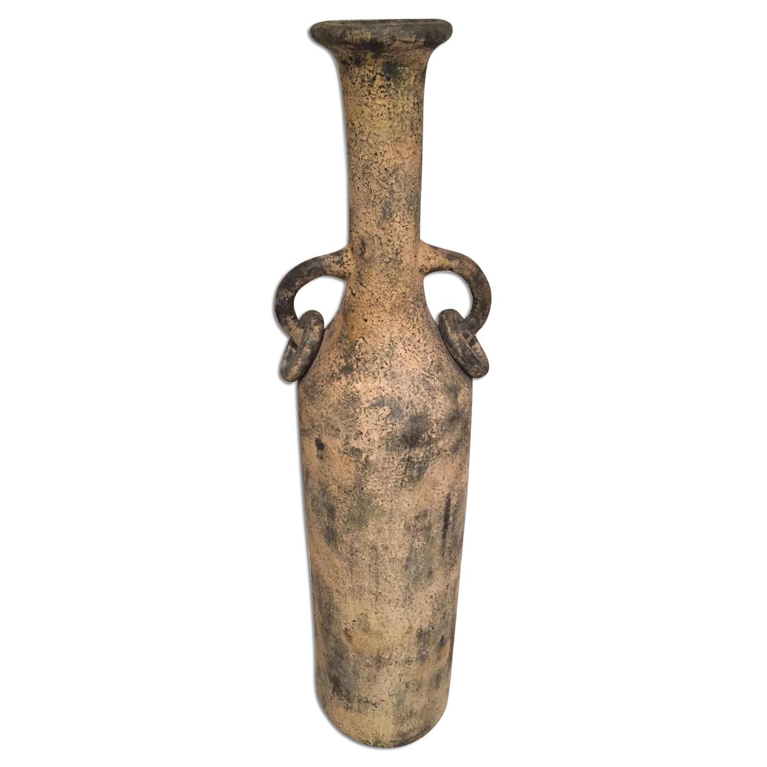 Seller's Notes:Large decorative Grecian Urn. Metal with a weather look finish that feels like stone. The color is a neutral/ grey mix.