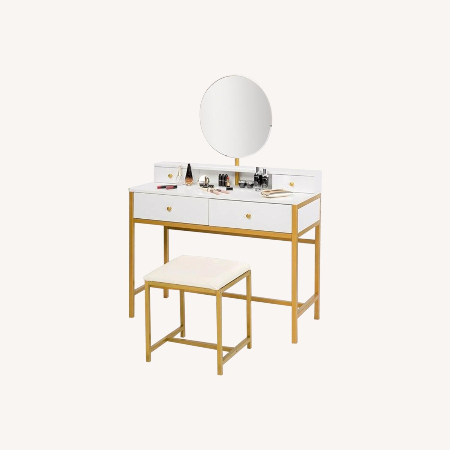 Seller's Notes:Length(cm):108Width(cm):85Height(cm):19Weight(g):21500 Large Capacity of Storage - Save you from mess of cosmetics with our large vanity table set. 4 table drawers in 2 sizes meets your needs to organize all kinds of your private belongings.Along with a spacious table top in size 40" x 17.7", our white makeup table set provides a lot of space for your storage. Functional Piece in Bedroom - Simple and elegant white & gold color design and all the storage makes it a functional piece of furniture to your bedroom. An ideal gift for female friends or family members of you. Superior Quality Material - Made of high quality MDF board and heavy-duty metal frame, this makeup vanity is ideal for long term use. Contained with a cushioned stool helps you enjoy the time when you sit in front of the vanity. Easy Assembly - The item will come well packaged. There are instructions and labels on each board and hardware, which helps you build up the item in ease. Please note: do not tighten the screws before all the screws are attaching in the metal frame. Deccent Size - Overall size is 40" x 17.7" x 53.1"--Vanity table; 15.4" x 15.7" x 17.7"--Vanity Stool. Should you receive our product with any flaws or damages, we encourage you to take pictures to us for a kind checking, and please always remember to keep its original packages ensuring any return demands. We will try our best to resolve any issues you encounter. Vanity Table*1 Stool*1 Assembly Manual*1 Note: Products with electrical plugs are designed for use in the US. Outlets and voltage differ internationally and this product may require an adapter or converter for use in your destination. Please check compatibility before purchasing.