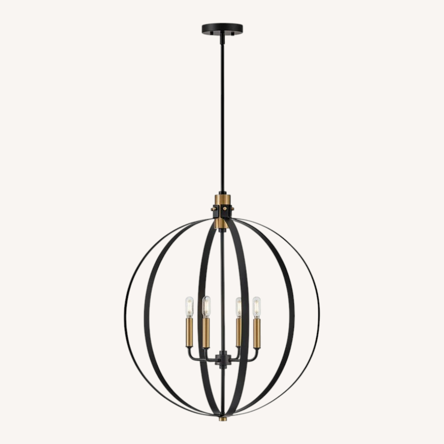 Seller's Notes:Turn your ceiling into a conversation starter. This Lark Cirque 24” chandelier brings that modern, airy “designer home” vibe with its open orb cage design, finished in black steel with lacquered brass accents. Details: • Brand: Lark (Cirque Collection) • Size: 24” W × 24” D × 27.5” H • Max hanging height: 60” (adjustable rods included) • Finish: Black steel + lacquered brass accents • Bulbs: 4 candelabra (E12), up to 60W each (not included) • Mounting: Hardwired ceiling fixture • Style: Modern / transitional, open cage orb design Extras: • Includes rods (6” + 12” lengths) for adjustable hanging • Works great with decorative/filament bulbs for extra style