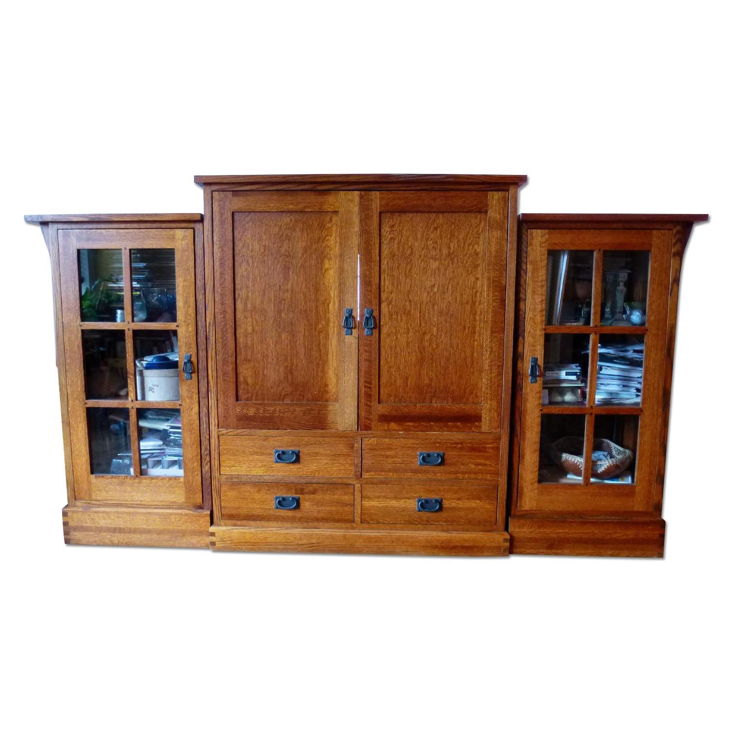Seller's Notes:3 piece solid wood Mission style entertainment center, bookshelves on sides are separate pieces, tuck-away pocket doors. Middle piece Width 45.875", Height 54.875" Depth 23.125" TV area, Width 37.75", Height 28.75" Depth 16" Side pieces: Width: Top lip 25.5", bookcase part 22.5" Height 50" Depth 19.5" Some sun damage on left bookcase and left pullout door