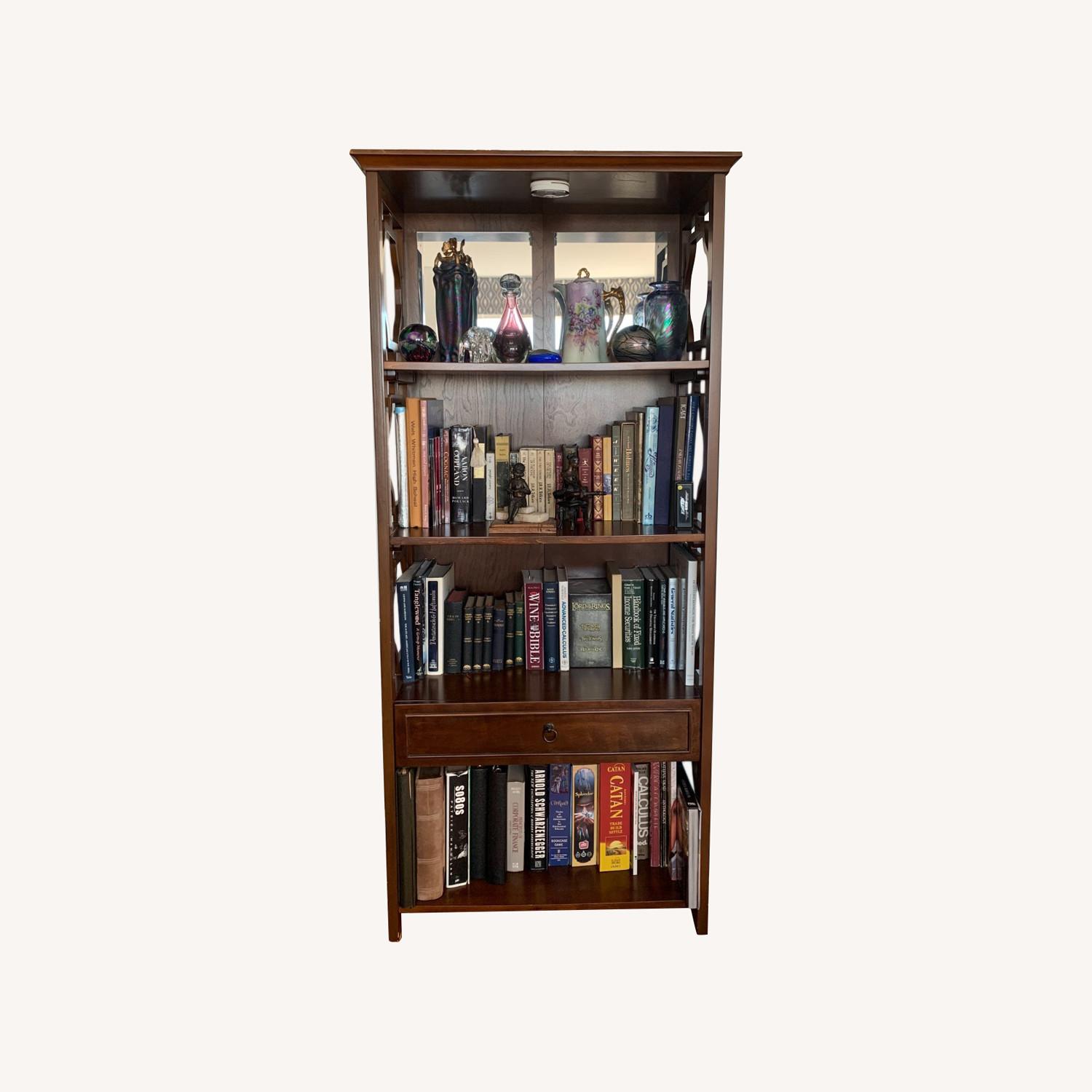 Seller's Notes:This elegant bookcase in dark wood is not only decorative but highly functional. It contains four shelves, each one measuring a generous 15" high, along with a long drawer that measures 6" in height, perfect for storing paper and smaller items. The decorative open lattice work on the sides, along with a lovely mitered finish piece at the top makes this bookcase a gorgeous addition to your home. The back piece is made of plywood. The top shelf has a mirrored detail. No damages.