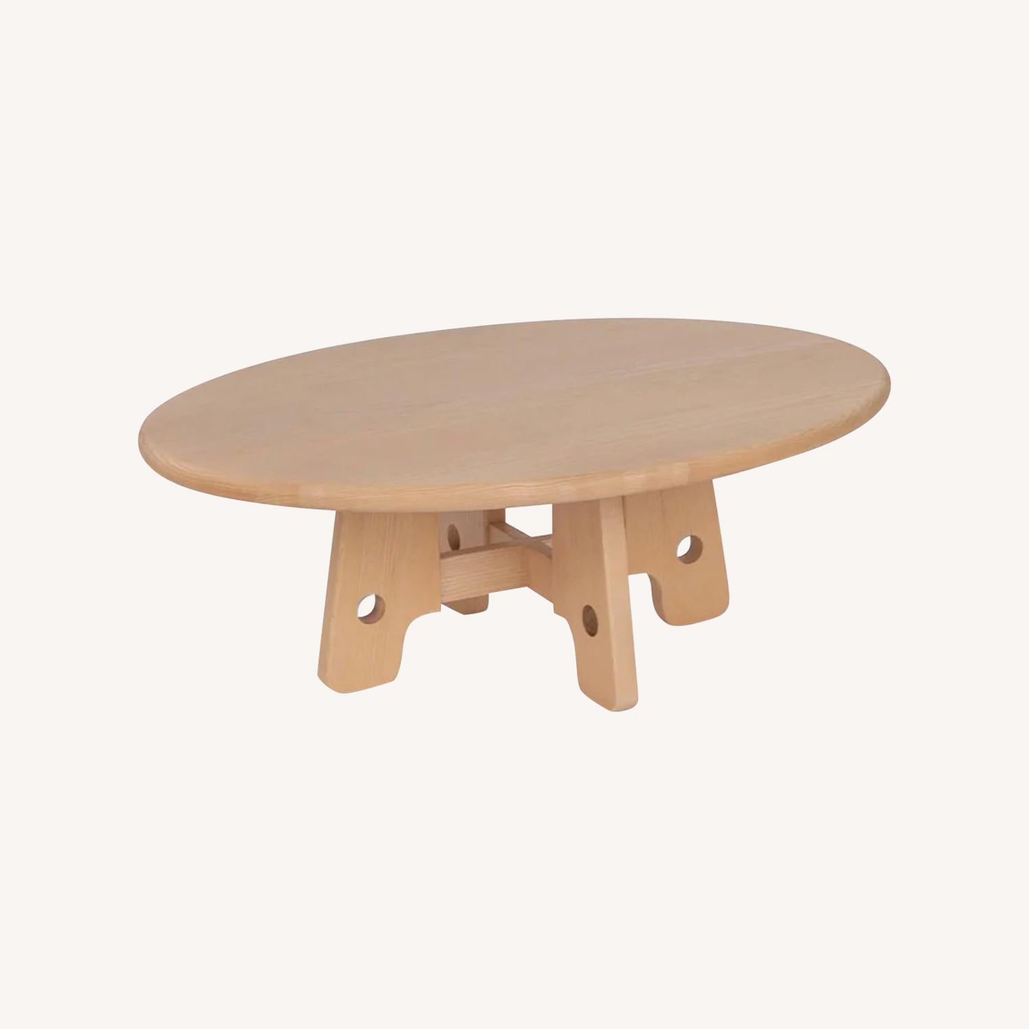 Seller's Notes:Item Like New! We are transforming the space and coffee table does not fit new plan. Span Coffee Table features a sculptural base with circular cutouts and a round wood top.