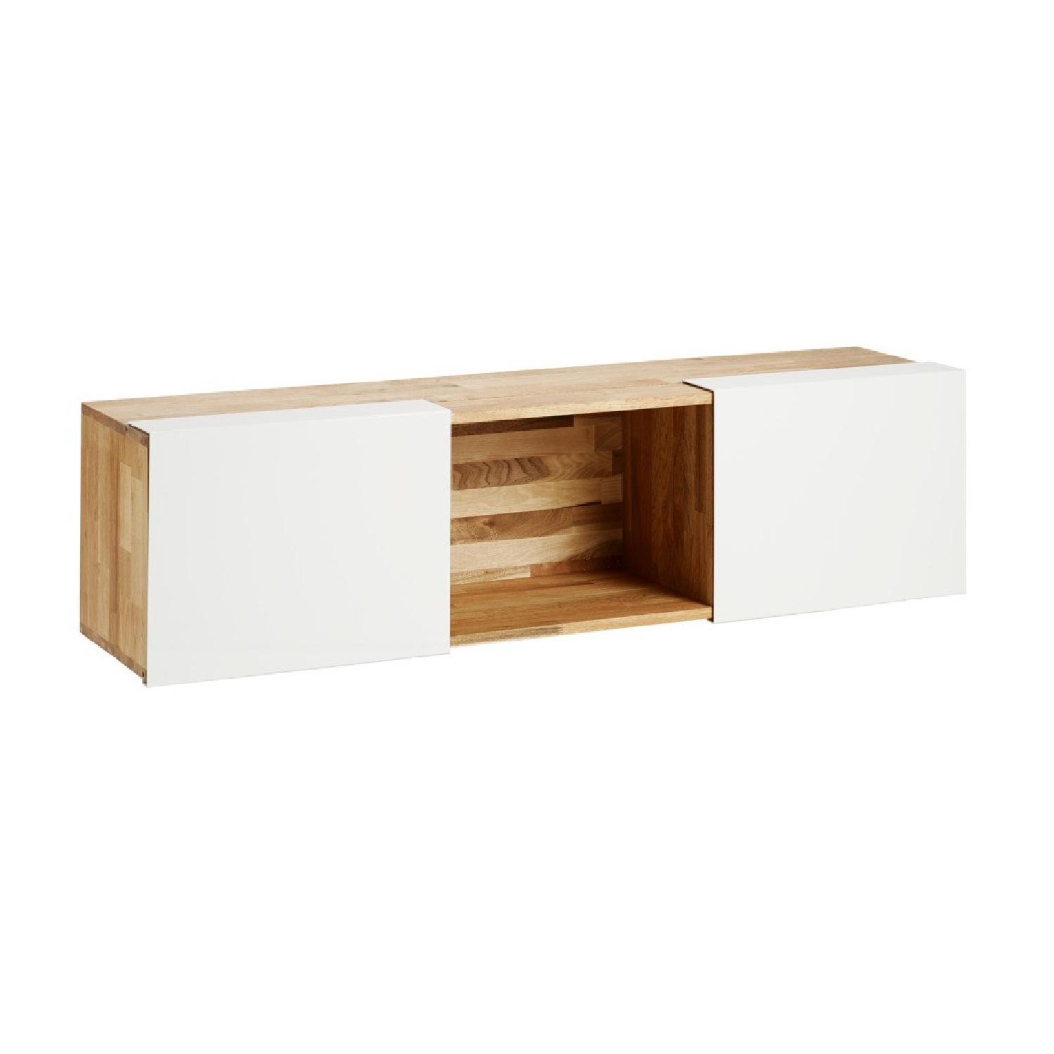 Seller's Notes:The piece that started it all and is still the most loved today is the 3X Shelf. With the 3X mounted on your wall, your treasures will be taken to a new level. For the things you’d rather not show off, keep them concealed behind the two sliding cover panels. Powdercoated white metal sliding doors. Solid English Walnut