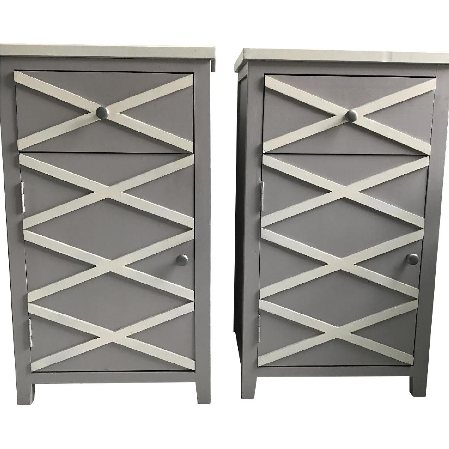 Seller's Notes:- Purchased from Layla Grayce, same table also available at Safavieh. This model has one drawer up top, and a door that opens with two shelves for great extra storage. We used these as bedside tables but could work anywhere! - One table has a bit of wear where the wood comes together (picture provided) but can probably be fixed with touch up paint, it's not very noticable unless you look for it. A few minor scratches that are not very noticeable as well. - Link provided below though the model I'm selling is a different size and style.