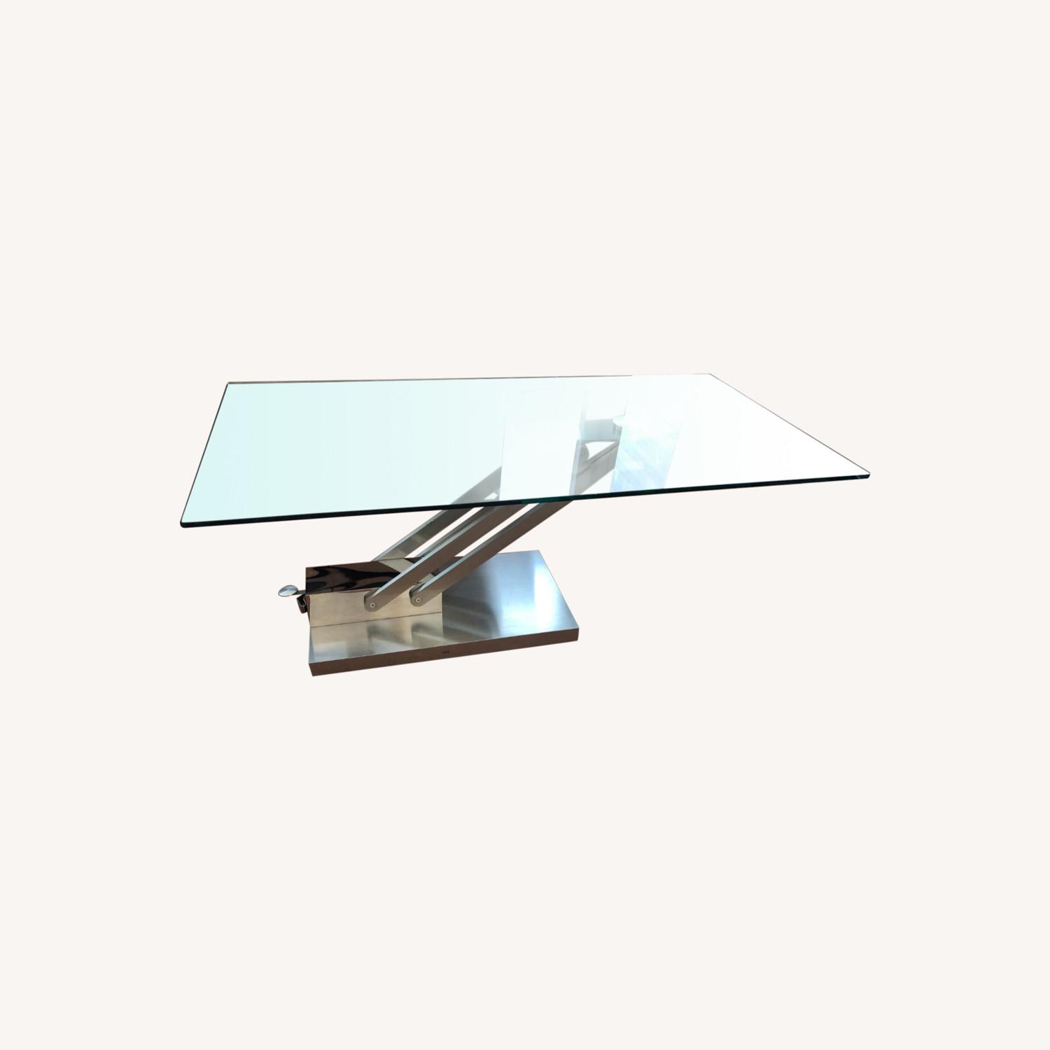 Seller's Notes:This is a beautiful transparent lazzoni merlot coffee table. It does have a minor chip from the close up photo where you push down to adjust the height of the table.