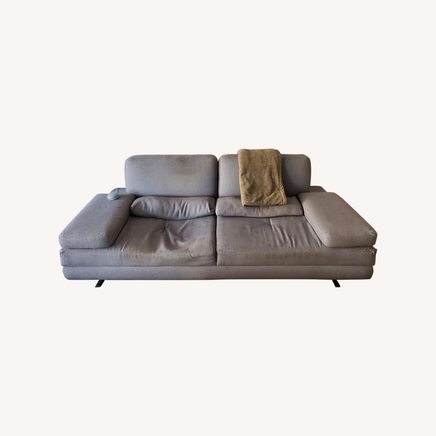 Seller's Notes:This was purchased four years ago at the Lazzoni Flagship store in New York City. It has been an amazing sofa as both the arms and backrests expand outward to allow for more space, take naps, or have guests use as a bed. The frame of the sofa is steel, and solid, while the upholstery has been weathered due to my cat scratching some of the upholstery - but overall has held up well. There are a couple of water stains that can be removed via a Bissell, and the right side cushion is slightly concaved, but very comfortable. The arm rests are wide, so items can be placed on top.