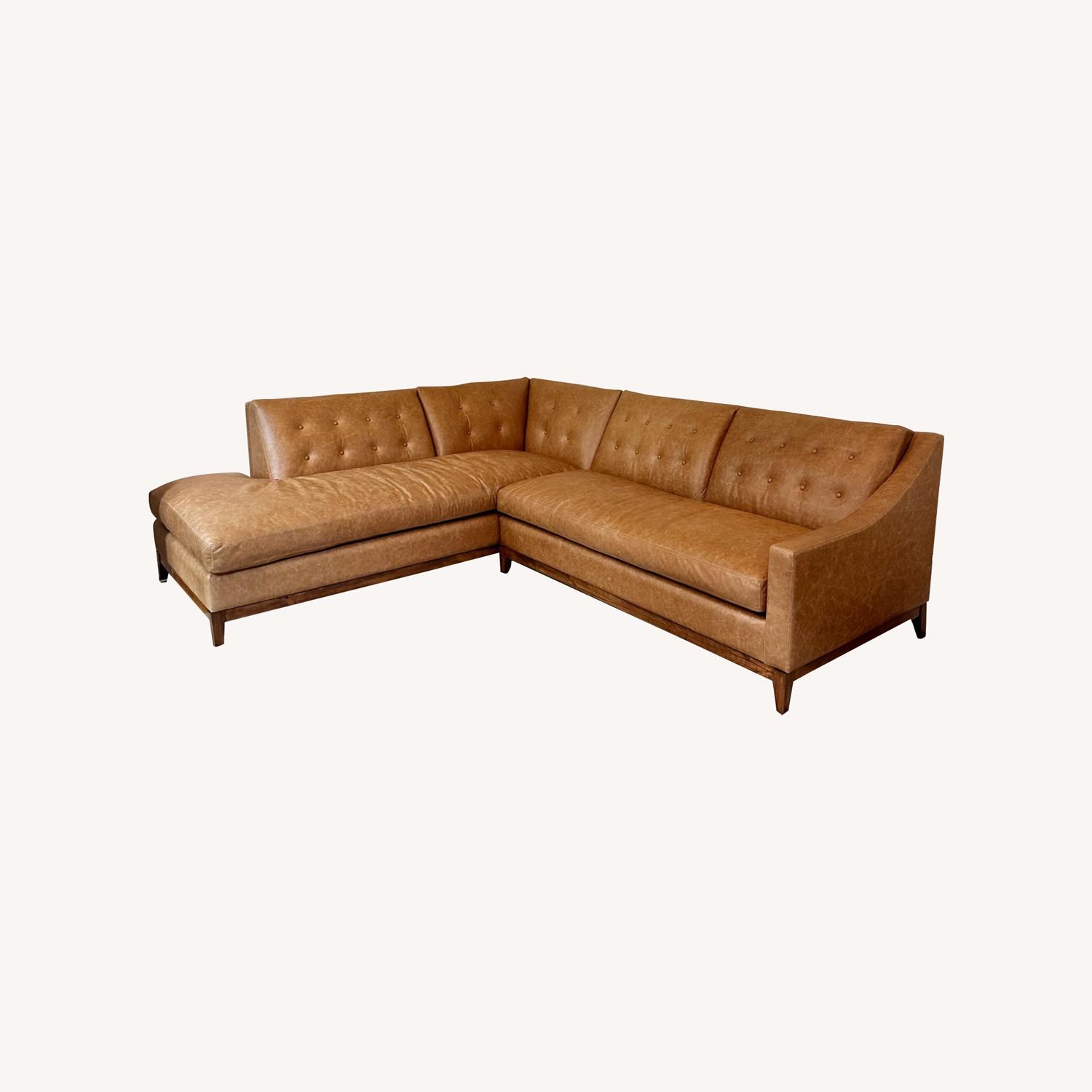 Seller's Notes:We bought this sectional one year ago from Furniture Envy in SF. We had it custom made. It's a mid-century modern, tight back with tufting on the back. Real leather, cognac color. Premium cushions with a full-size pullout bed. Bed mattress is memory foam and has been used only once. Legs are early american stain. Sloped arm. Measures - 104 inches by 91 inches (chaise side); 38.5 inches deep, seat 24.5 inches deep; 34 inches height.