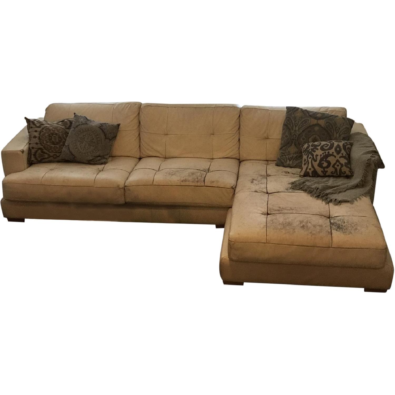 Seller's Notes:Moving sale: Selling our well loved custom Italian leather sectional. It is cream colored, and high quality leather, but unfortunately, we gave our puppy free access to it, and he chewed up the armrest last year. This can easily be hidden with a throw blanket as shown in the first photo, but the damage is pretty big, therefore the steep steep discount. This sectional was $8,500 originally. Check out our other pieces we are selling due to our move.