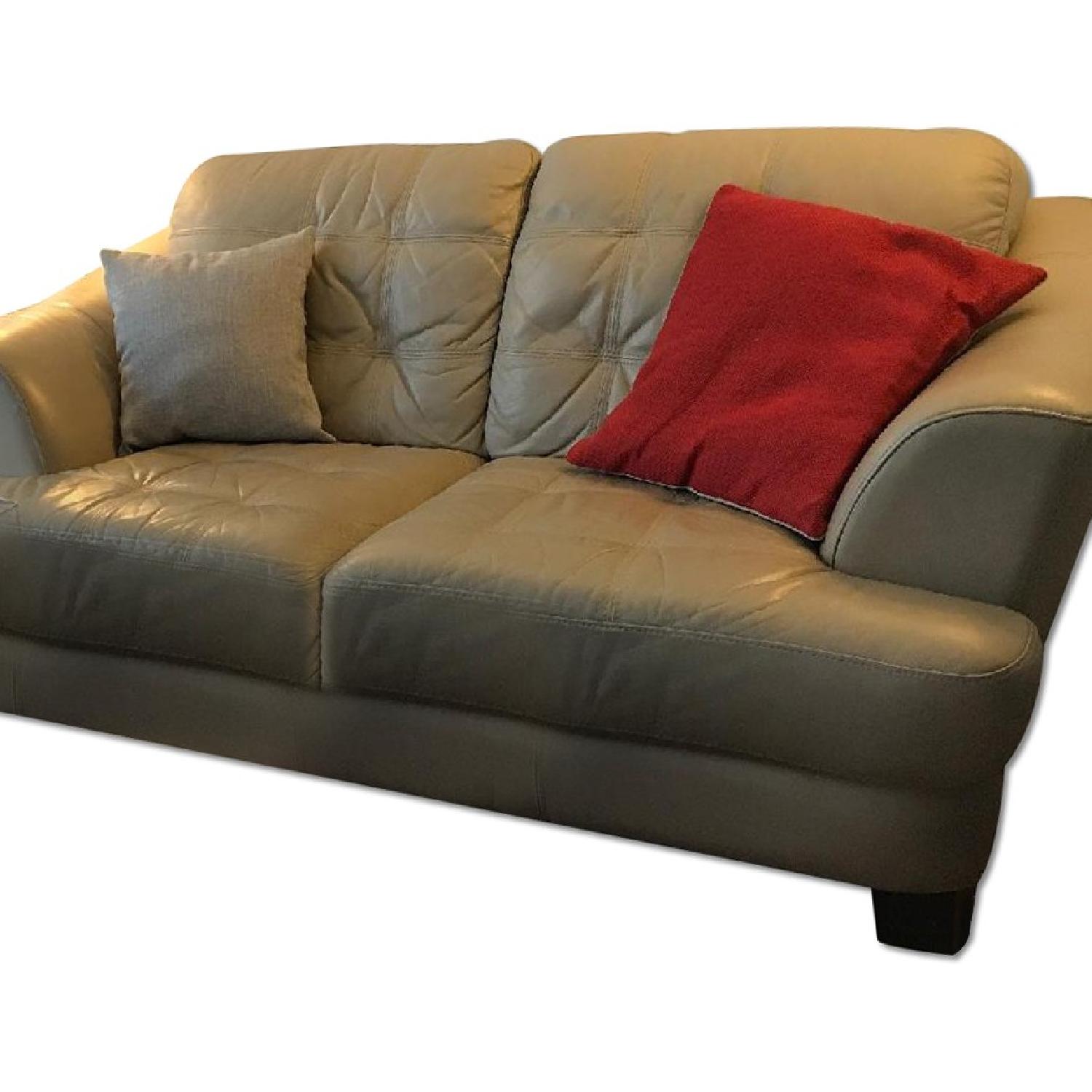 Seller's Notes:I'm moving soon and my new apartment has different dimensions, so I'm looking to sell my existing furniture. 3 pieces: cushioned loveseat, oversized chair and separate ottoman (that matches both pieces). Super comfortable cushioning. Beige leather in good condition with dark wood legs. Sofa Dimensions: 65" W, 39" D, 23" seat depth, 29" H Chair Dimensions: 41" W, 39" D, 23" seat depth, 29" H Ottoman Dimensions: 28" W, 21" D, 17" H Paid $1,400 at retail.
