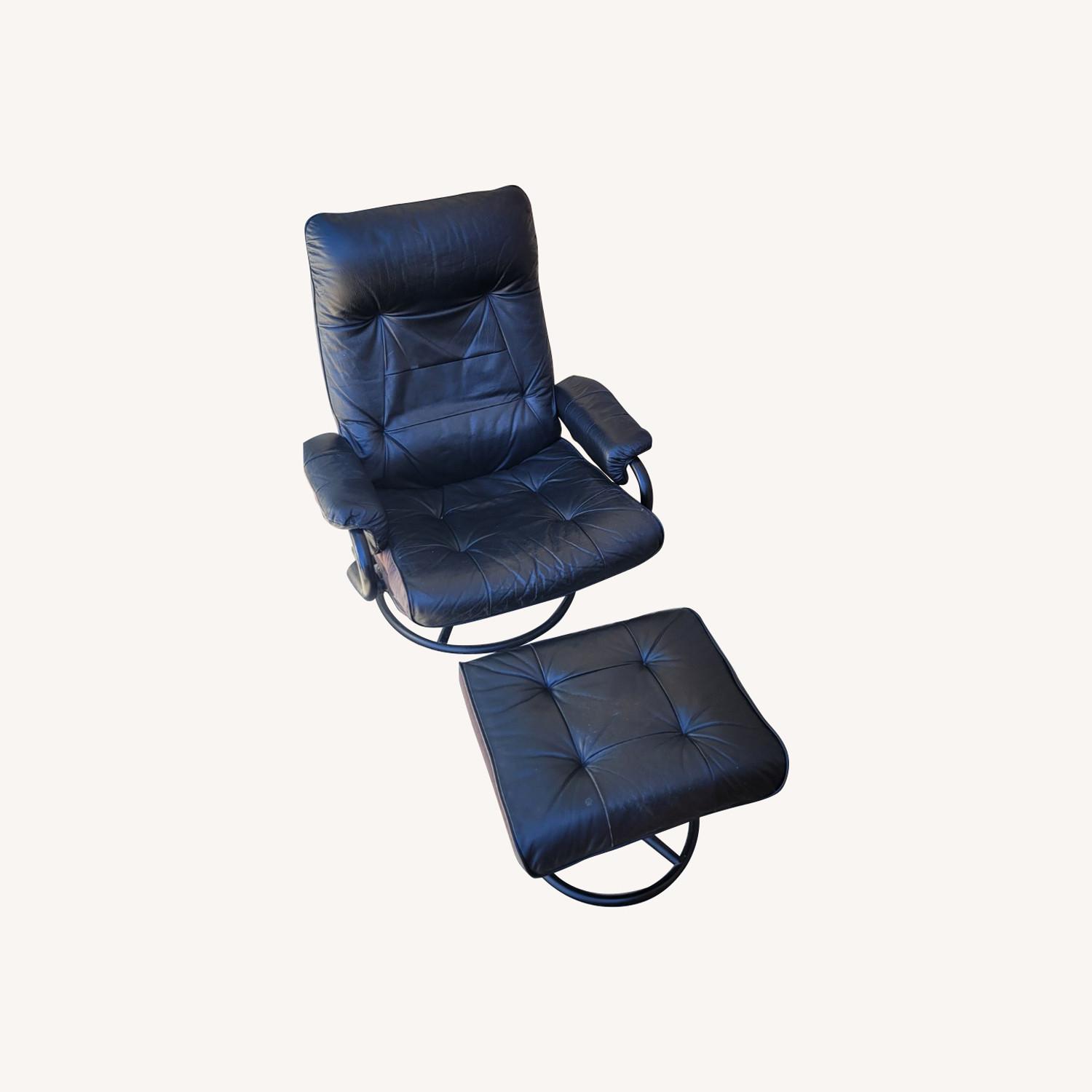 Seller's Notes:Leather Reclining Lounge Chair by Chairworks with Footstool. Recline in the style of Ekornes. Good condition - no major damage to leather. Material on back of chair has been discolored from sun shining through window. black leather recliner with tubular bent aluminum frame and swivel base. 17" seat height 38” height 32” wide 28” deep Circa - 1990s Condition - Good Manufacturer - Chairworks