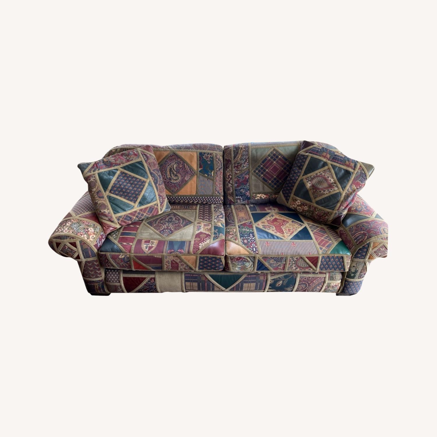 Seller's Notes:Leather Suede and Fabric Patchwork Sofa. Hardly used over the years. Was Situated in extra room which was rarely occupied.
