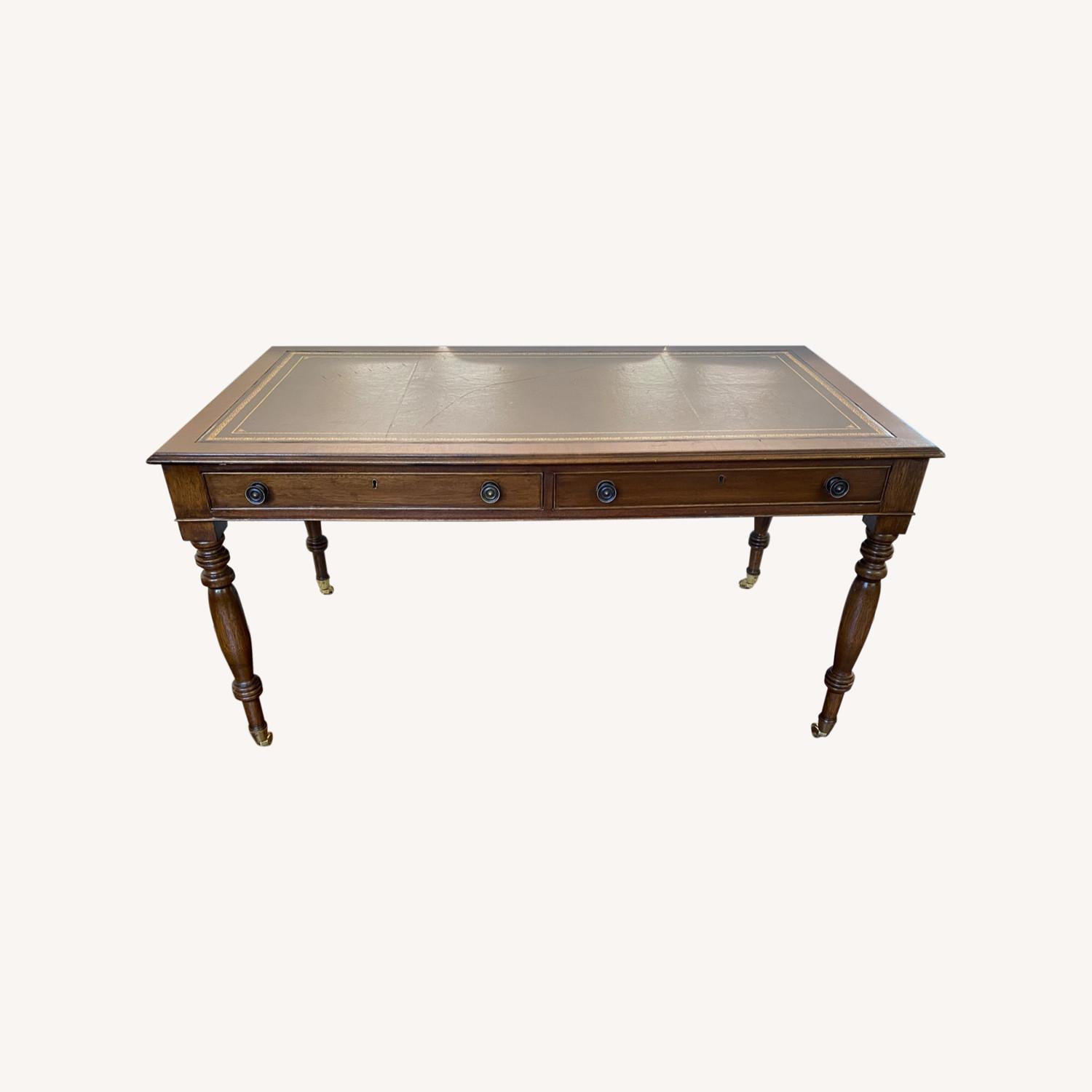 Seller's Notes:This desk is made of real wood, dark brown in color. It has two drawers with nice hardware pulls, and a black leather top. Brass casters on bottom. A great functional piece for the office or as an elegant addition to a formal living room.