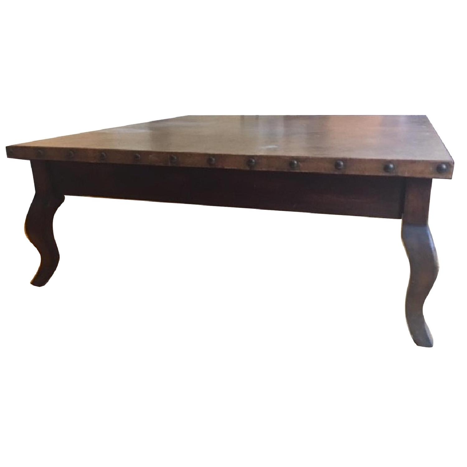 Seller's Notes:This large, sturdy, leather and wood coffee table has a removable top, which is fortunate because the leather will need to be replaced. It is still perfectly functional but has multiple scratches and marks on it.