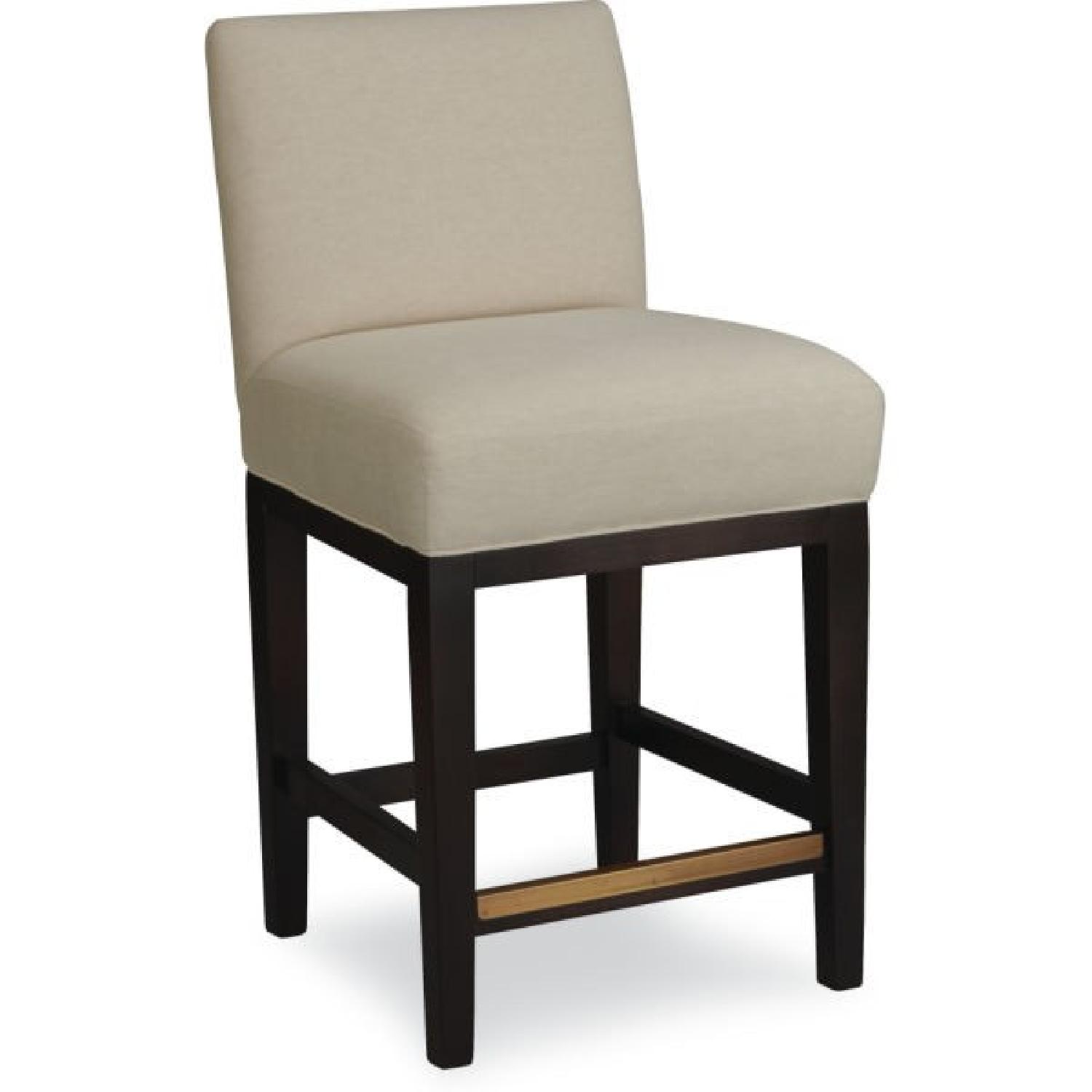 Seller's Notes:Set of three upholstered counter stools from Lee Industries Earth Friendly furniture. Dark stained wood legs with foot plate protection on cross bar. Neutral upholstery with a hint of grey. Excellent condition, no stain, rips or defects.http://www.leeindustries.com/style_detail/lee/id/7003-51/in/7003_51_0909