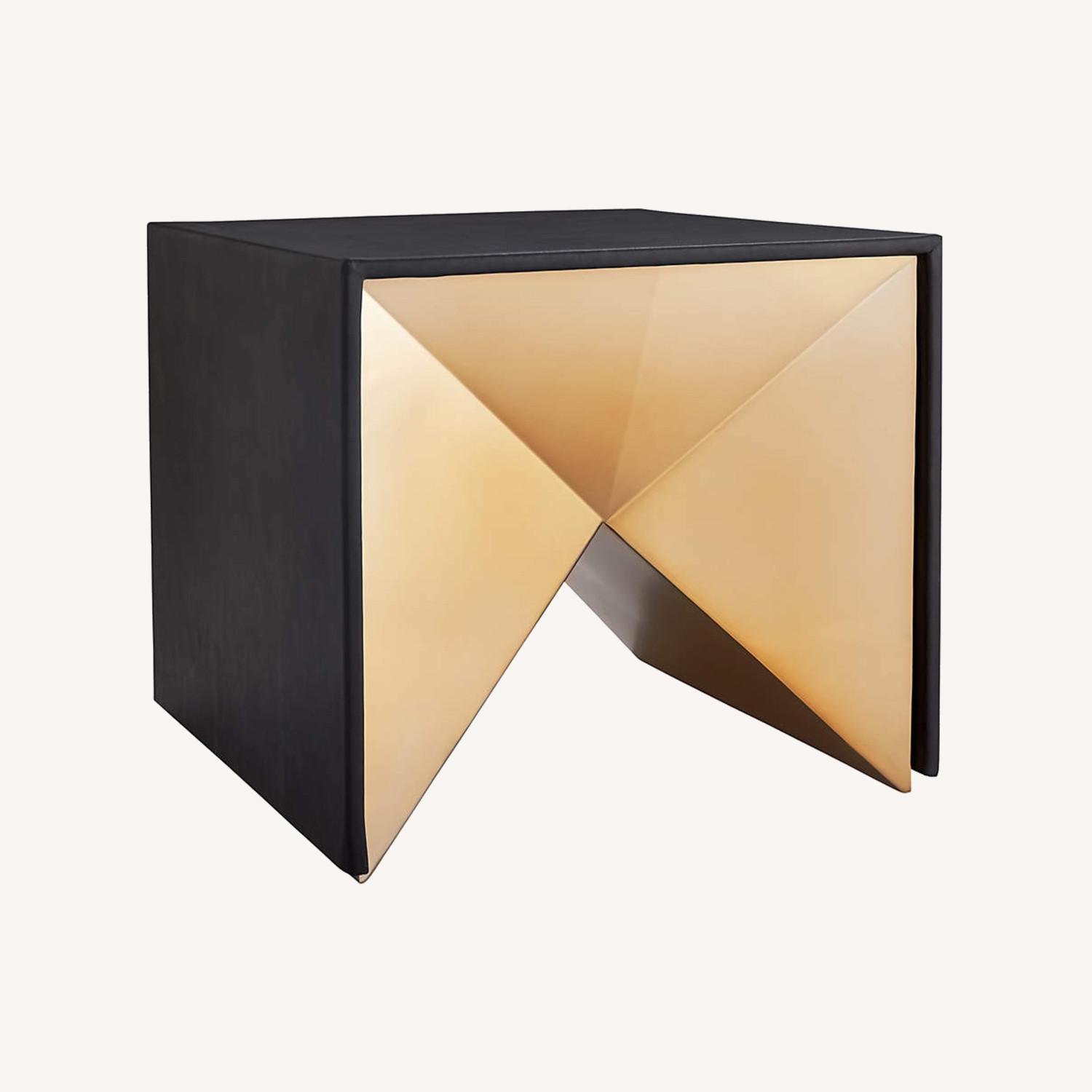Seller's Notes:Excellent condition. Nova Side Table. 18"Wx18"Dx16"H Designed exclusively for CB2 by Kravitz Design Frame: Genuine black leather over engineered wood Base: Brass-plated sheet metal