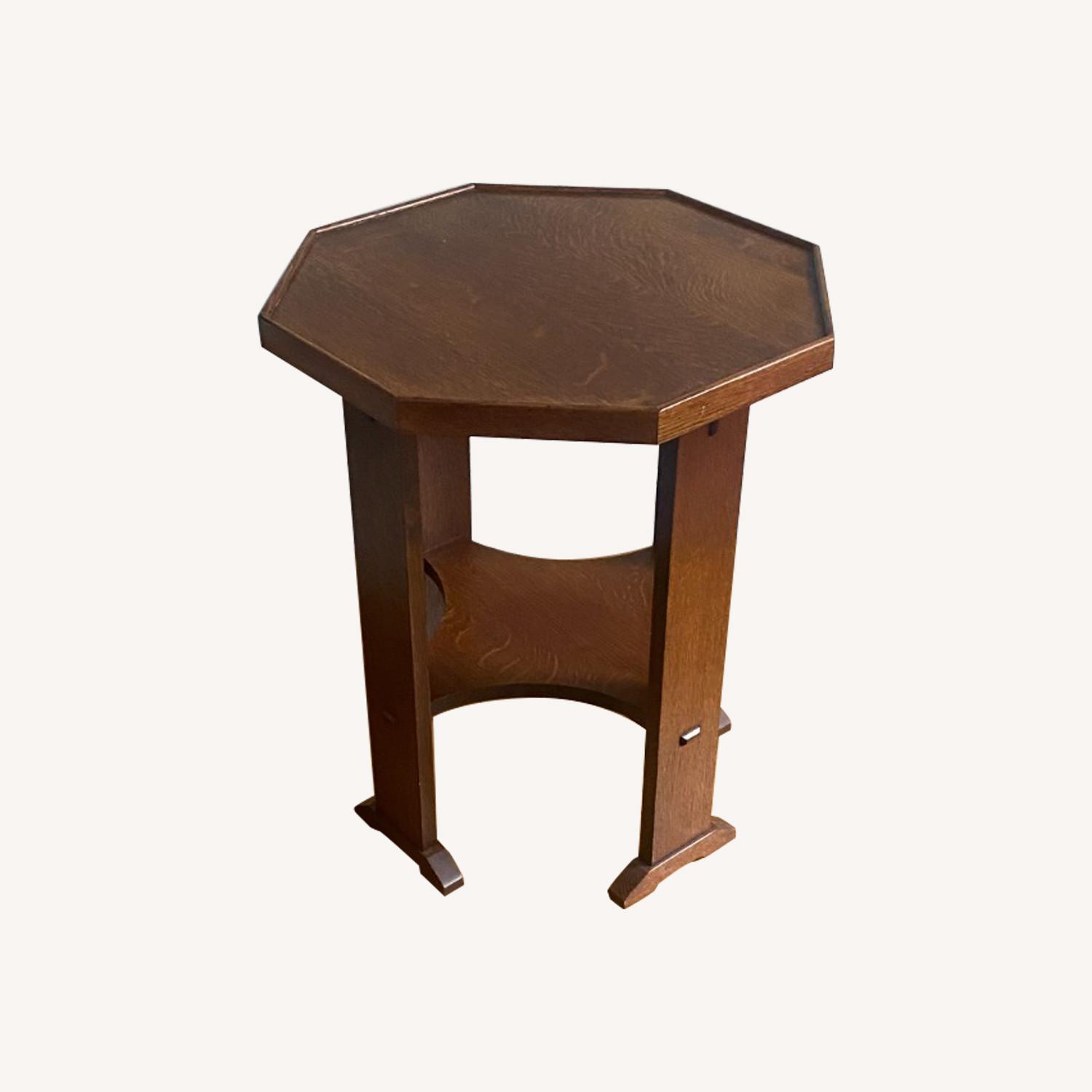 Seller's Notes:A Leopold Stickley design from circa 1910, this table features shoe foot legs that are secured to the top and center shelf with mortise and tenon joinery. This beautiful table is part of the original April 1989 reissued Mission Collection. Available in solid oak.