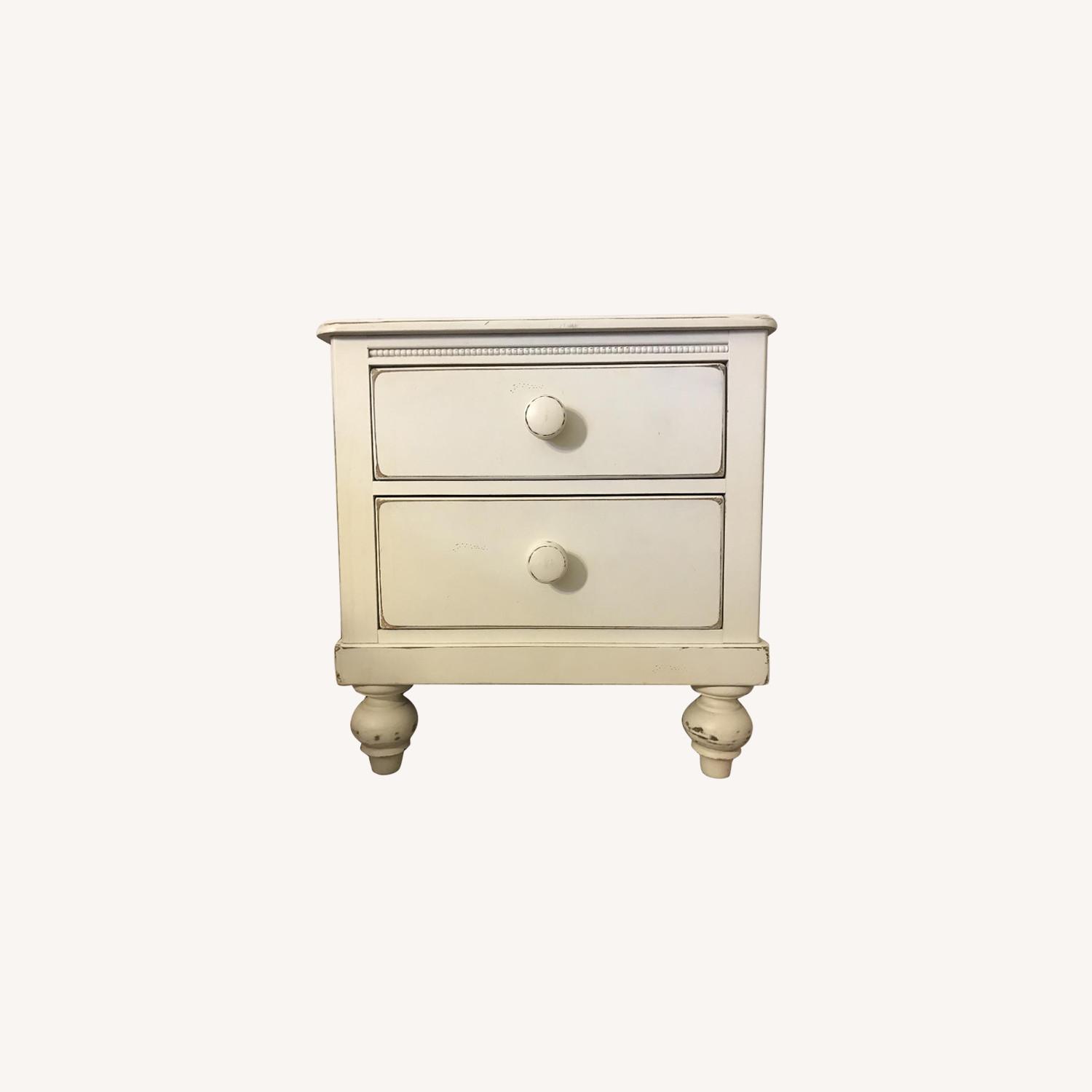 Seller's Notes:White distressed solid wood night stand with two drawers. Lots of detail in the wood. This was part of my daughter's bedroom furniture. Was purchased through a family member who was an interior decorator and had access to designer pieces. Twenty years old and has marks and discoloration you'd expect on children's furniture, especially on top.