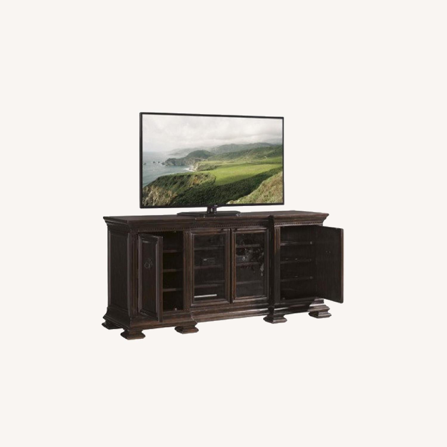 Seller's Notes:Two raised paneled doors reveal two adjustable wood shelves behind each. The center area has two adjustable shelves with a media/storage drawer below. INCLUDES the Sligh StrongArm TV Mount