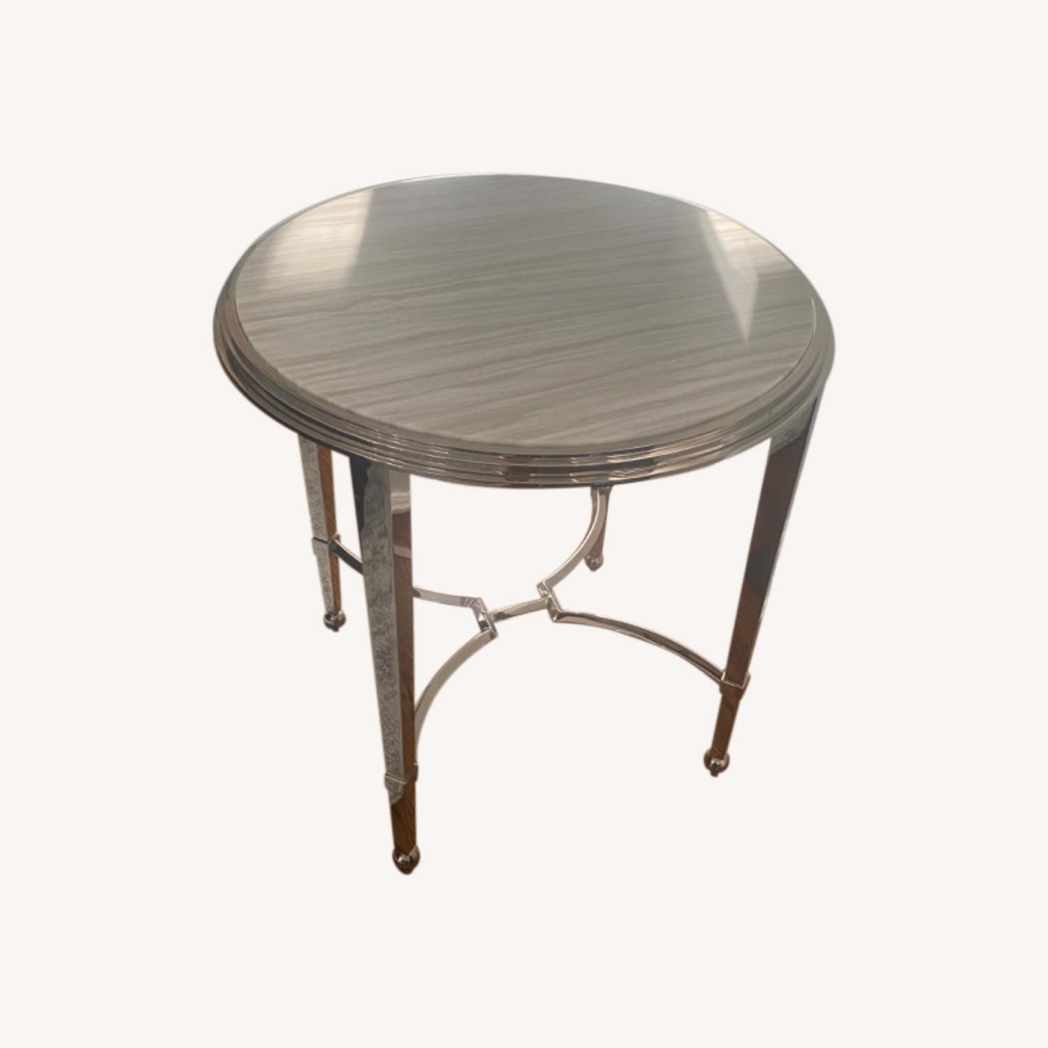 Seller's Notes:Beautiful round end table set! Italian silhouettes in polished stainless steel with tapered legs and an inset silver travertine top. Travertine is a product of nature and may vary from piece to piece. We are changing look of living room! Brand new and never used- less than 1 year old! The website above is for the rectangular version of the end table
