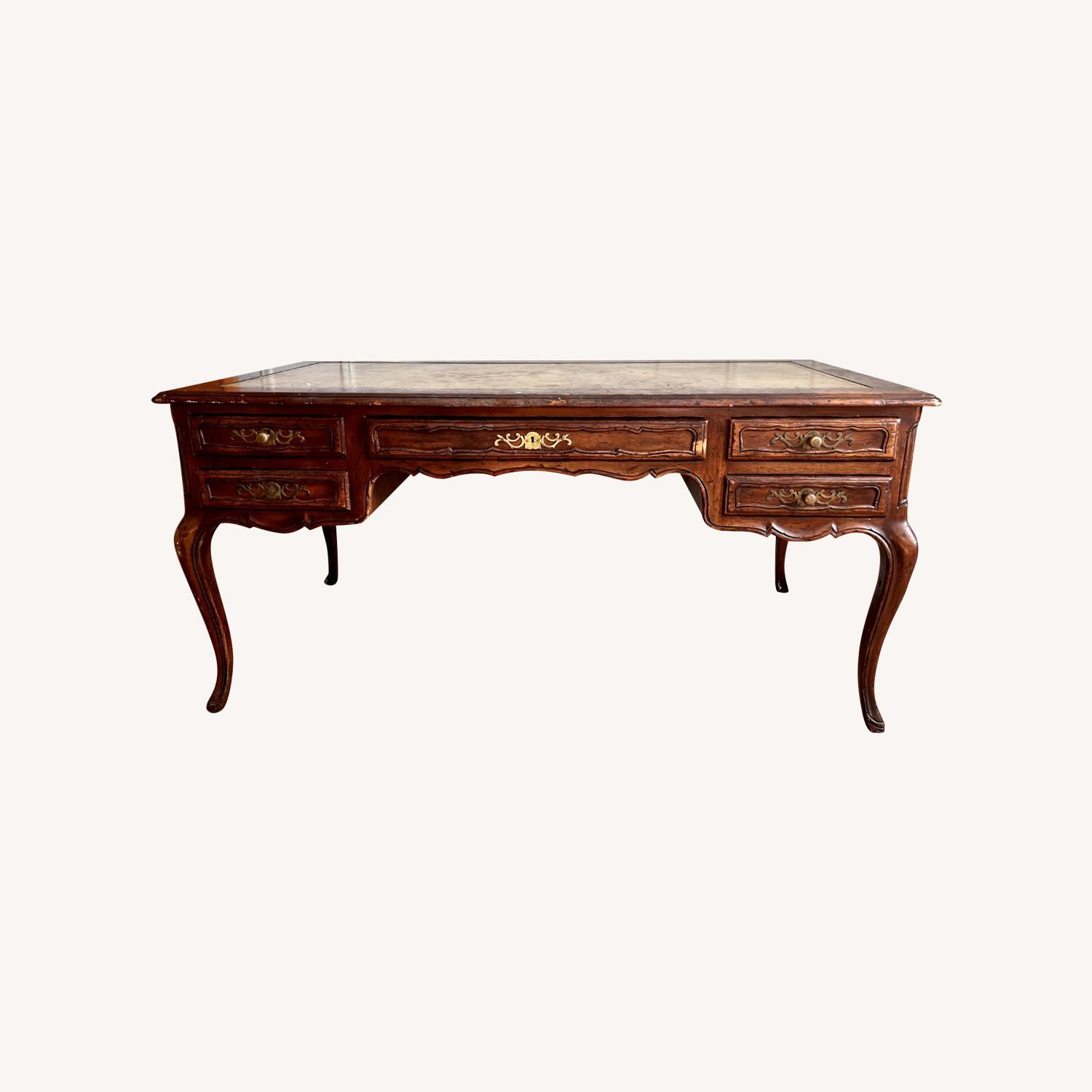 Seller's Notes:This desk was purchased from an antique store several years ago by a former roommate. It is a large, heavy wood and leather desk with beautiful detailing. It is well-loved with lots of scratches, marks, and some missing hardware. A great find for someone who loves antiques and/or is interested in furniture restoration.
