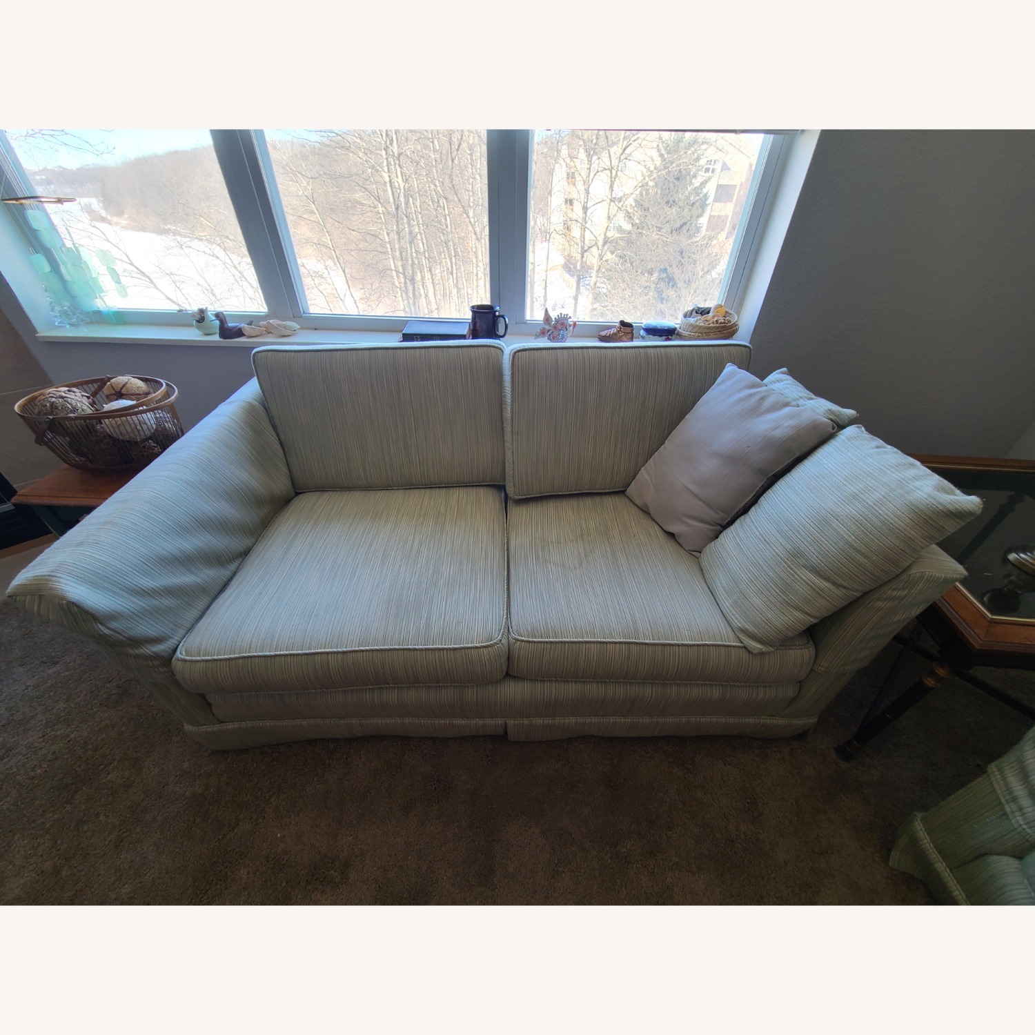 Seller's Notes:Cozy antique couch and love seat for sale.It's got a textured fabric and is in great shapes.Super comfy and perfect for your living room.All cushions come off and the covers come off.The cushions, these are quality.Antique couches comes with extra fabric