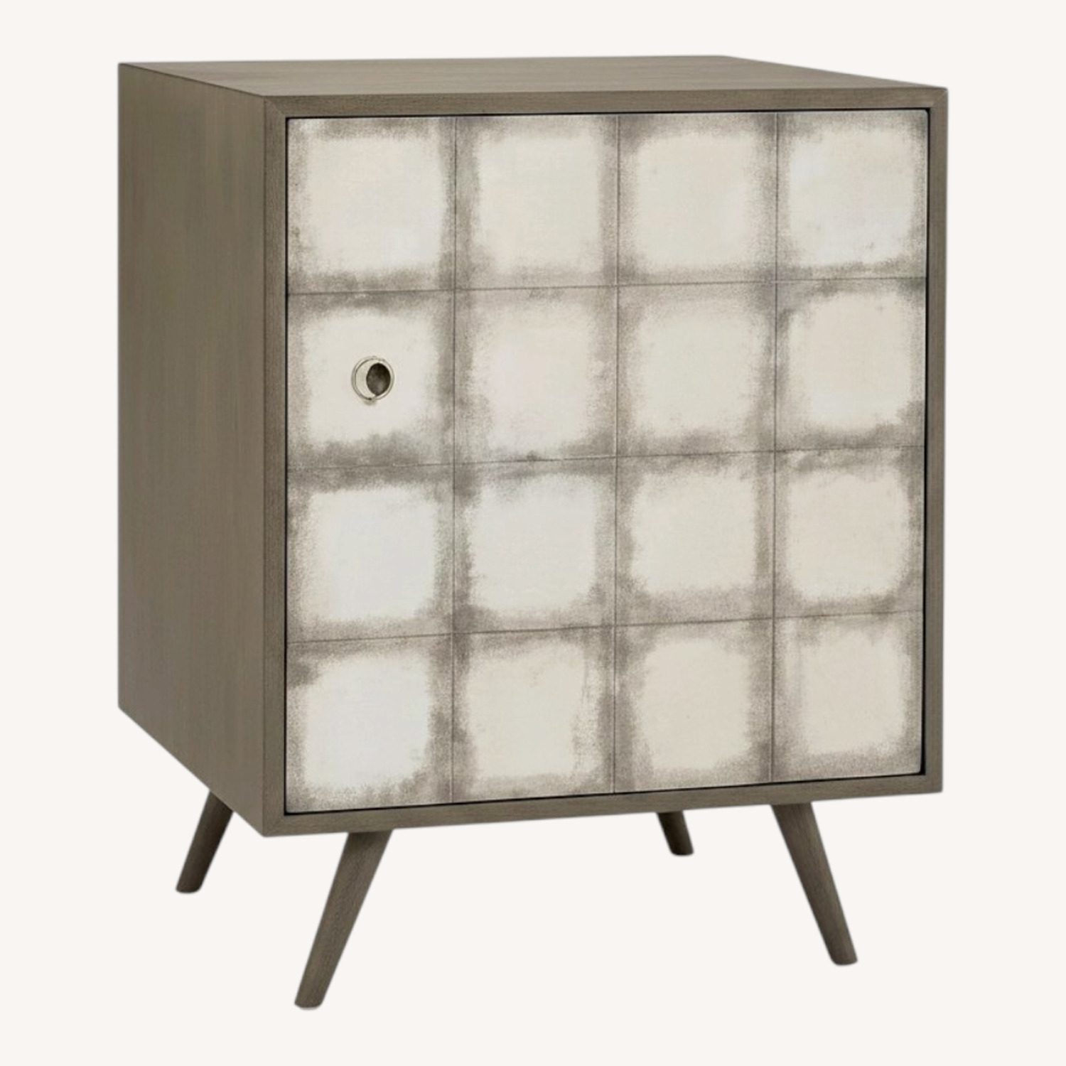 Seller's Notes:Franklin bedside table bedside Gold Leaf from the American manufacturer DwellStudio is made in art Deco style with a modern twist. The frame is made from fanerovannoy larch, tapered legs made of solid larch. Side table color of butter cream, inside there is a fixed shelf. Paneled doors upholstered and hand-finished with gold leaf. Lucent multi-layer coating creates an amazing visual effect. A bedside table can serve as a bedside, or to place statues or expensive gadgets. The company DwellStudio is one of the most innovative brands in the field of production of furniture, bedding accessories and home decor. In furniture production the company uses only materials that meet the requirements of CARB.