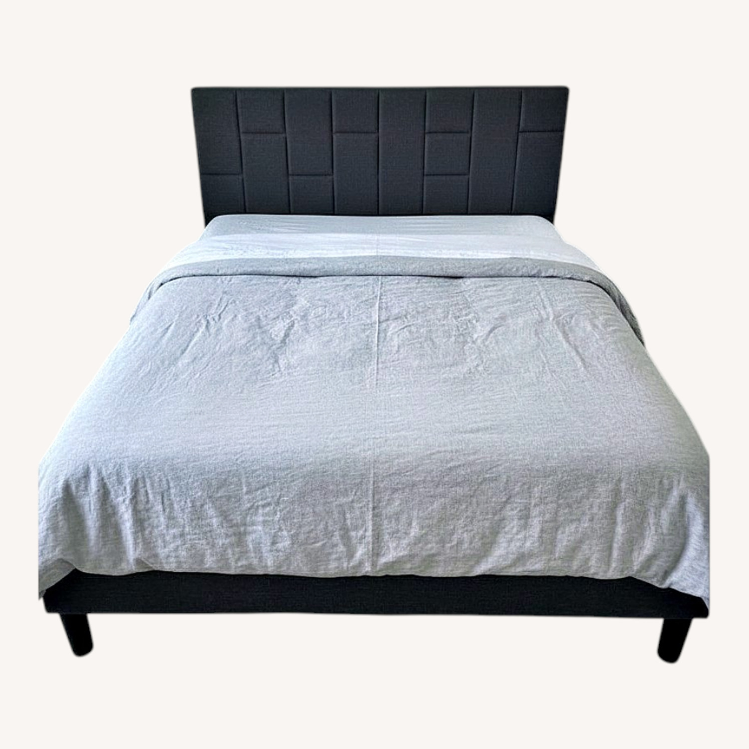 Seller's Notes:LIKIMIO queen platform bed with grey linen upholstered headboard. Excellent condition, no damage. Wood slat support — no box spring needed. Quiet, no squeaks. 80.5"L × 60"W × 43.3"H. Originally ~$180. Disassembles for transport. Moving May 14, pickup LIC 11101.