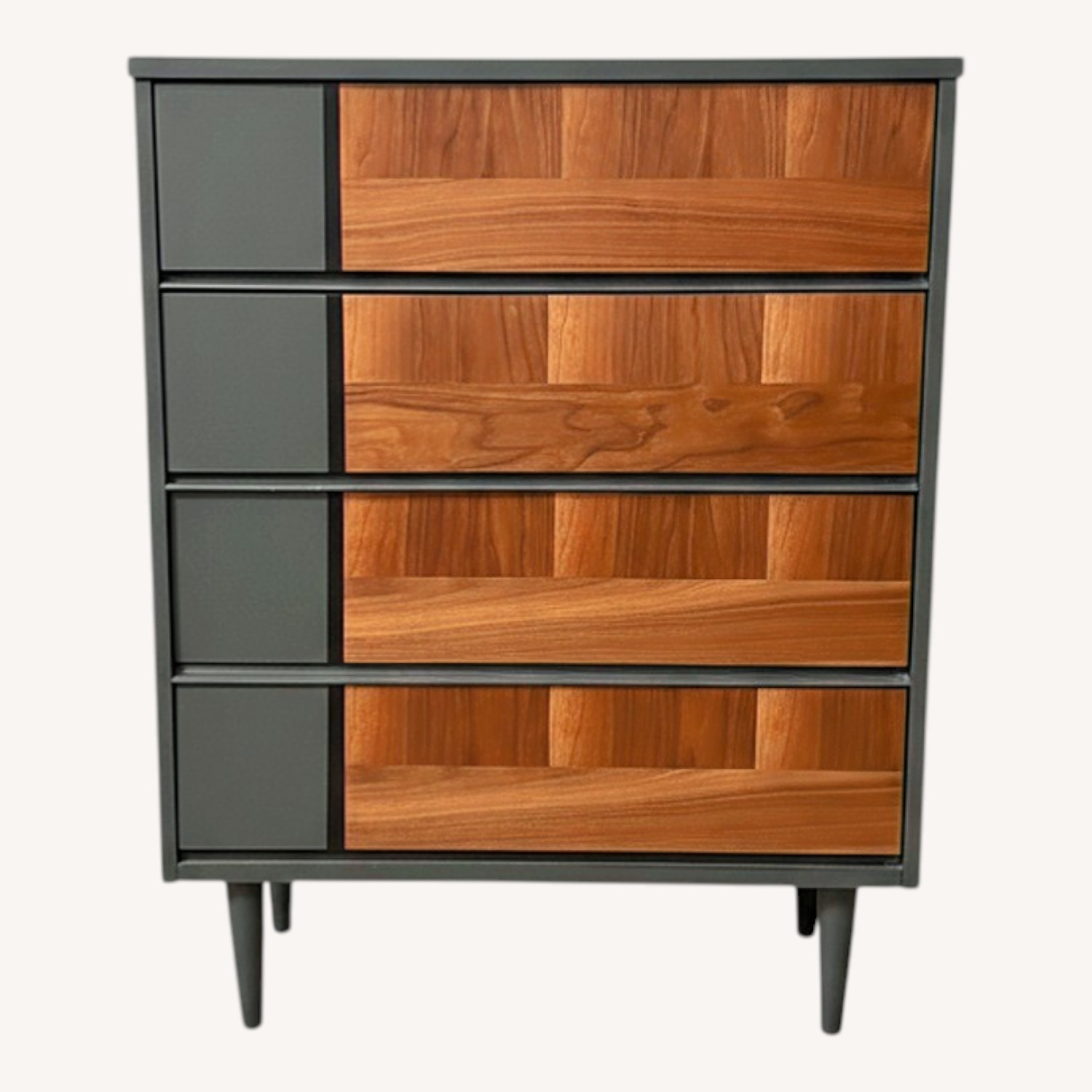Seller's Notes:This classic 4 drawer mid-century modern tallboy has been redone in Farrow and Ball’s Down Pipe with a black pinstripe detail to set off the gorgeous patterned wood grain. ►DIMENSIONS: 34”w x 17.75”d x 43.75”h Bought this for around $800 on Etsy and it’s in great condition. A tiny bit of paint came off on top (see picture), but you can easily fix that yourself and it will pretty much look brand new again. I’m not going to be able to take it to my new place unfortunately! It’s a great deal and absolutely beautiful!
