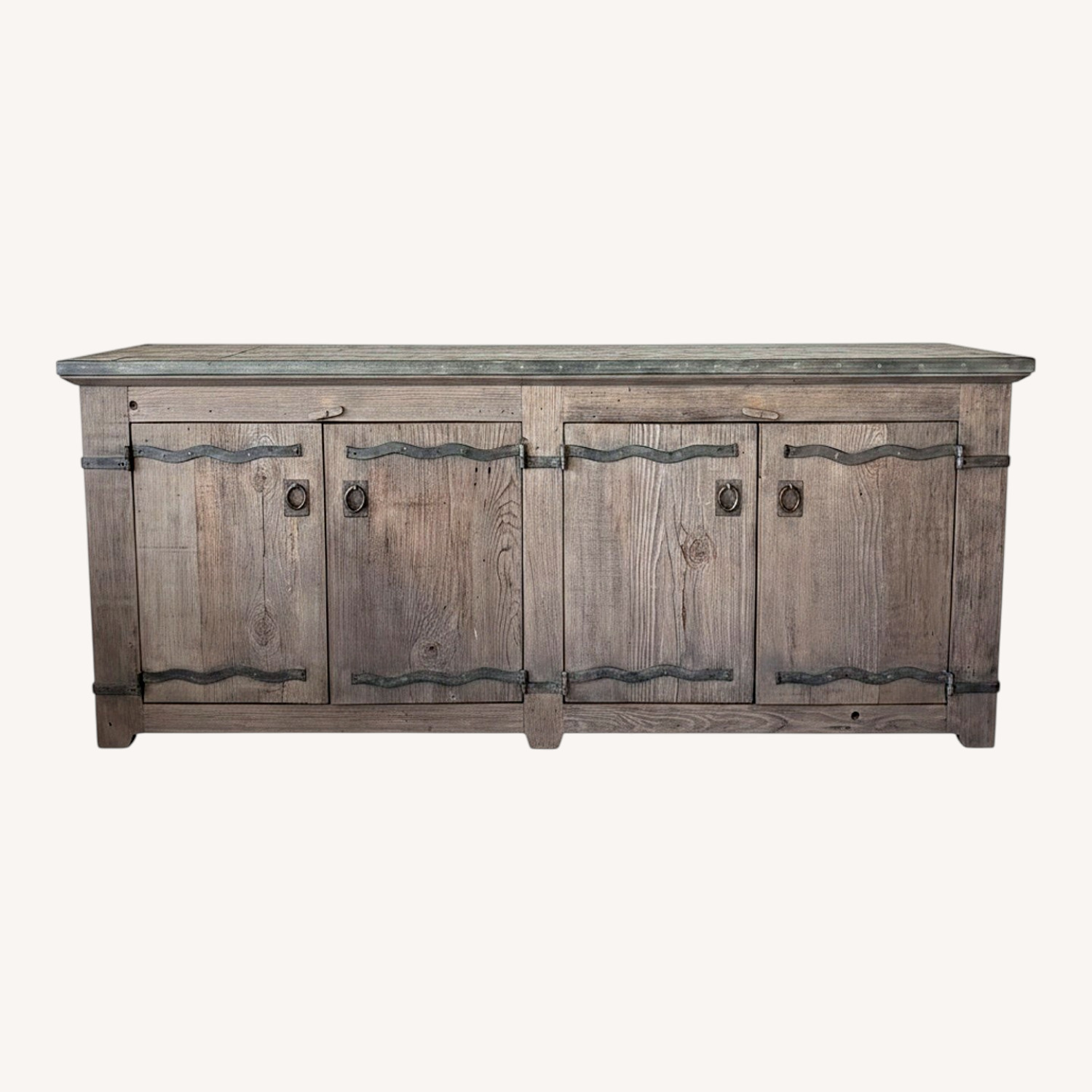 Seller's Notes:Crafted by John Brigham using reclaimed wood( from old barns) and materials, this pine buffet offers a distinctive blend of rustic charm and industrial character. The piece features a rectangular zinc top detailed with visible rivets, adding tactile interest and reinforcing the utilitarian aesthetic. The lightly distressed painted finish gives the pine body a soft, timeworn appeal, while metal braces and hardware provide a contrasting industrial edge. The façade presents four doors fitted with iron ring pulls and surface-mounted strap hinges. These doors open to reveal a painted interior with a planked back and full-width 2 shelves storage compartment below. Raised on sturdy block feet and designed with clean lines, this buffet balances vintage farmhouse warmth with a practical, modern sensibility. It’s an ideal piece for kitchen or dining spaces where both function and character are key. by John Brigham using reclaimed wood( from old barns) and materials, this pine buffet offers a distinctive blend of rustic charm and industrial character. The piece features a rectangular zinc top detailed with visible rivets, adding tactile interest and reinforcing the utilitarian aesthetic. The lightly distressed painted finish gives the pine body a soft, timeworn appeal, while metal braces and hardware provide a contrasting industrial edge. Four doors fitted with iron ring pulls and surface-mounted strap hinges. all wood interior with a planked back and full-width 2 shelves storage compartment below. Raised on sturdy block feet and designed with clean lines, this buffet balances vintage farmhouse warmth with a practical, modern sensibility. It’s an ideal piece for kitchen or dining spaces where both function and character are key. Bought at Summer house, MV for $7000; perfect condition.84"/36,5"h/21"depth