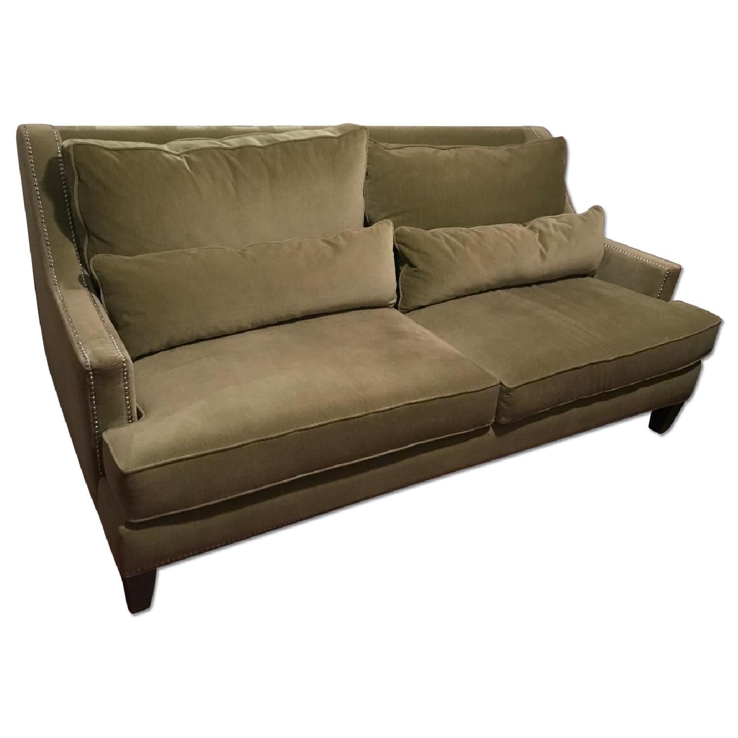Seller's Notes:Light green velvet couch with nail head trim details. This couch is very comfortable and makes a nice bed if you remove the back cushions. No sagging and overall is in pretty good condition. Some slight stains just from over time, but can be easily cleaned. This couch does come from a dog friendly home, although dogs were not allowed on the couch. We love this couch and would keep it, but we're moving and it won't fit in our new apartment. You won't be disappointed with this beautiful couch!