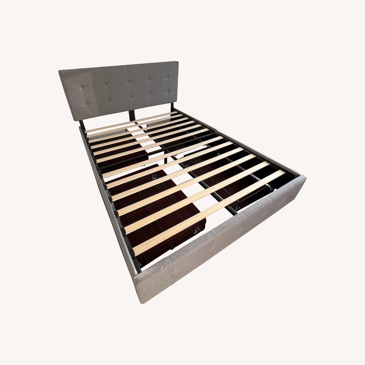 Seller's Notes:This is in perfect condition! Upholstered queen size platform bed frame with headboard and 4 storage drawers which are awesome for extra storage. No box spring needed.
