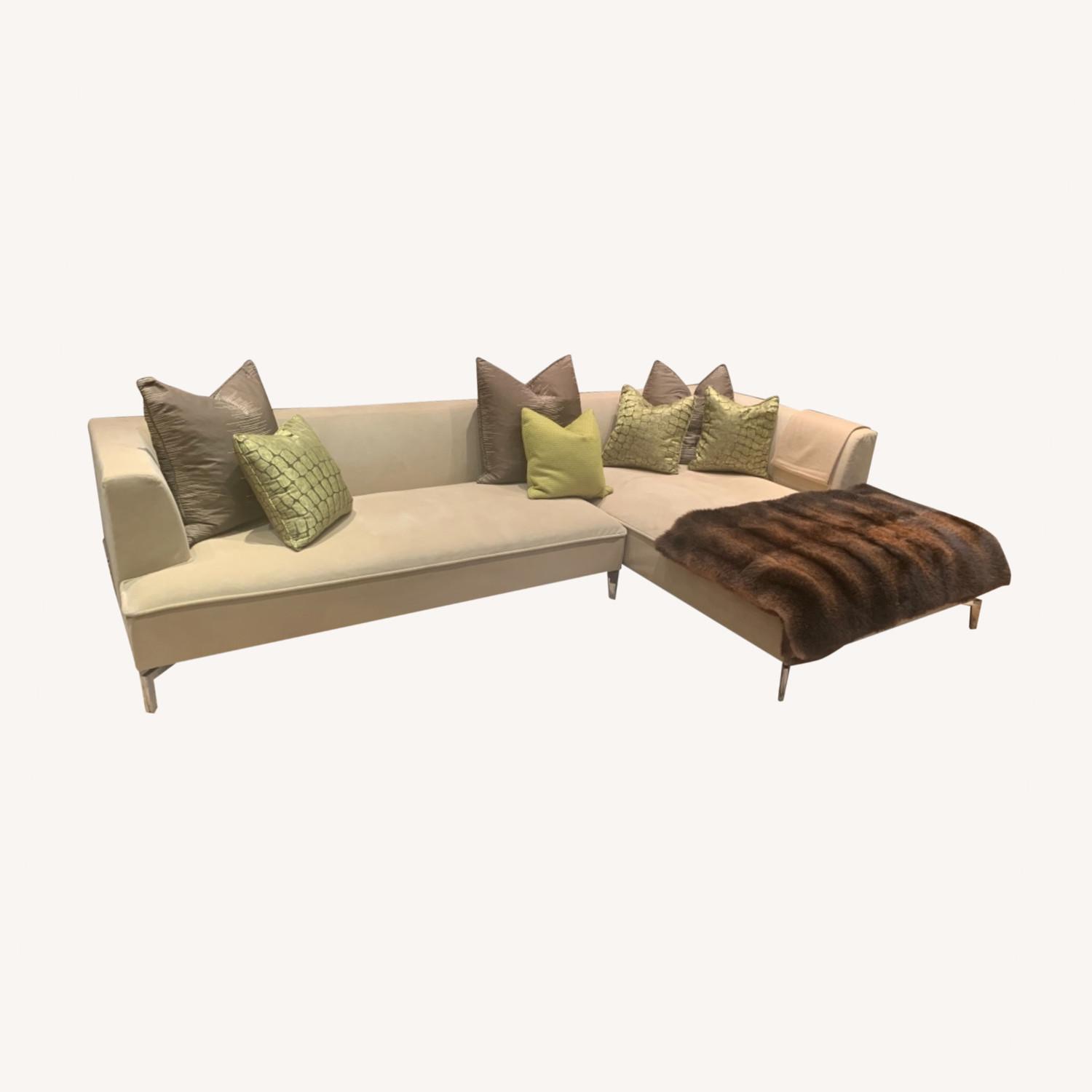 Seller's Notes:Ligne Roset Annaba Sectional by Didier Gomez upholstered in a natural/beige ultrasuede. Right-arm Sofa H 33.5" W 87" D 36.5" SH 15.75" Left-arm extra Chaise H 33.5" D 69.75" W 47.75" SH 15.75" Can be connected with metal hardware or situated separately. Pet and smoke-free home. The extra wide chaise is special!