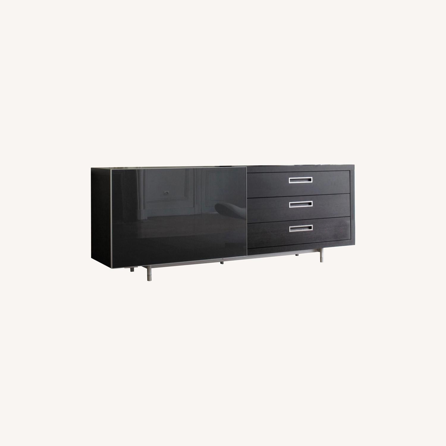 Seller's Notes:The Cineline sideboard chest of drawers from the French manufacturer Ligne Roset. A chest of drawers one sliding door and three shelves. Finish: stained ebony oak. Sliding door made of anthracite glass. Legs - metal, aluminium paint. The model is made in modern style. Wiring port installed in back of unit for cable and wire pass through if used for media storage.
