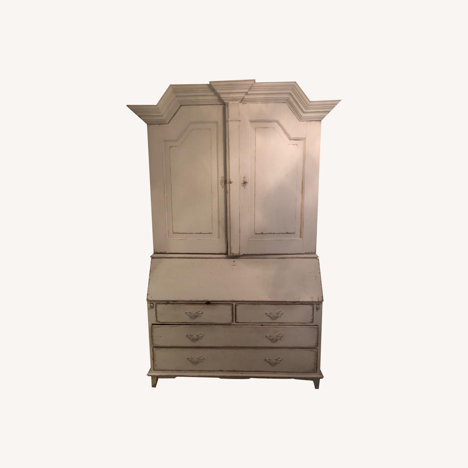 Seller's Notes:Function and form were the key ingredients of Swedish design in the eighteenth and nineteenth century…Lillian August replicated a rare antique secretary bought recently from a dealer specializing in ever popular Scandinavian antiques. Like the original, it is crafted from reclaimed pine with an authentic hand-rubbed gray milk paint finish. The interior drop-front-desk houses a charming configuration for stationary. Accented with hand forged iron hinges, and rings. Key plates and drawer pulls are crafted like the originals, in the Louis XV style.
