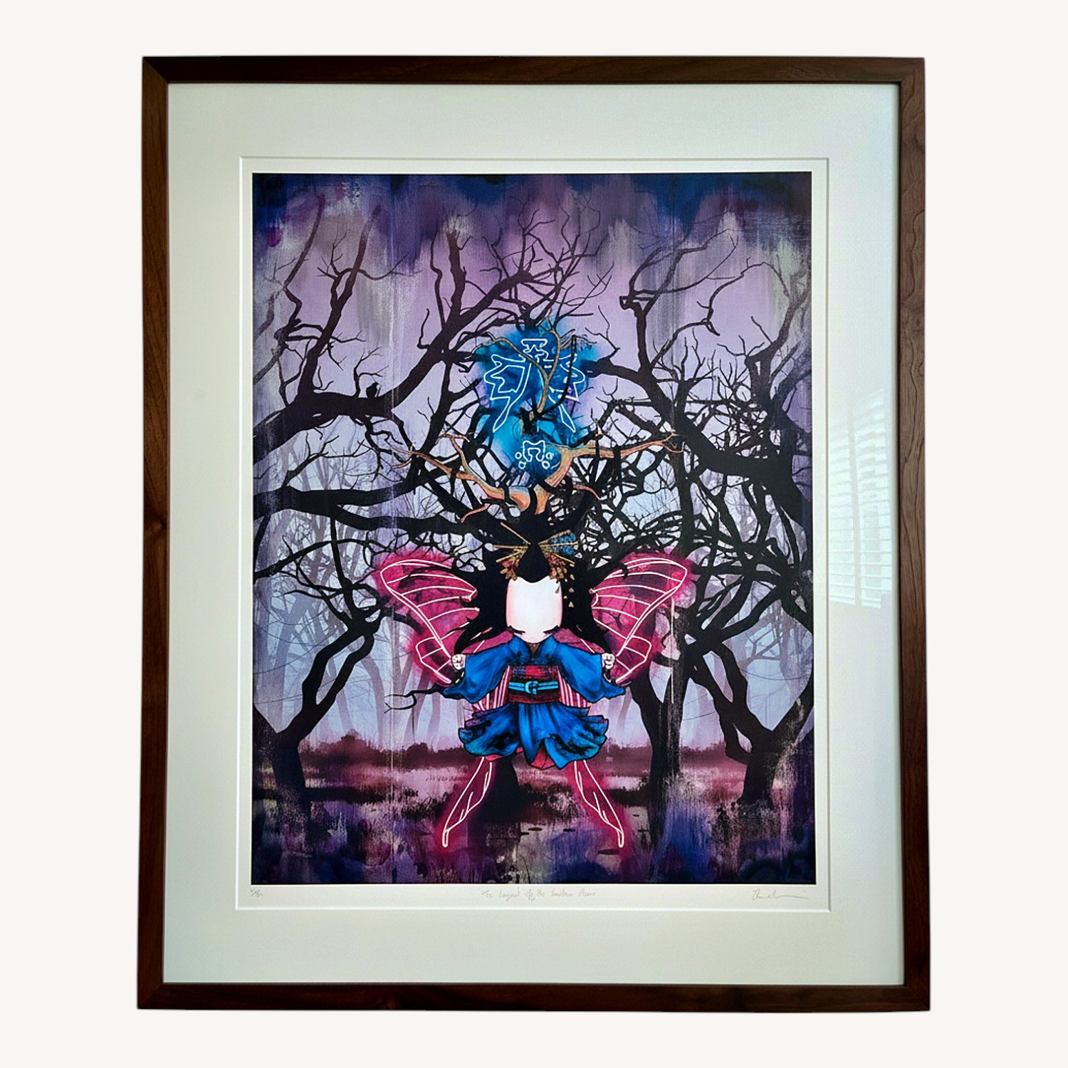 Seller's Notes: "The Legend of Koukuu Moon," is a rare limited edition hand signed artwork, edition 46 of 50 from year 2008 by the British artist and illustrator Tom Lewis. The print was purchased directly from the artist in 2024 and the framing is new. Tom Lewis is was born in Birmingham, UK in1979. He is a self described "pixel pest, paint pirate, and pencil punk." Lewis begins with pencil, and then might include markers, pen, acrylic paint, aerosol cans, airbrushes, varnish, cardboard, digital camera, and fingers, amongst other mediums. Themes are fanciful set in dreamlike environments. Gicleé print on Somerset Enhanced Velvet archival paper in absolutely mint condition. Archival framing and matting at the Georgetown Frame Shop in Washington, D.C. in 2024 with a beautiful walnut wood frame and 92% UV protection Artglass glazing. Image dimensions: 69cm x 55cm (27in x 22in) Matted and framed overall dimensions: 91cm x 77cm (37in x 30in)