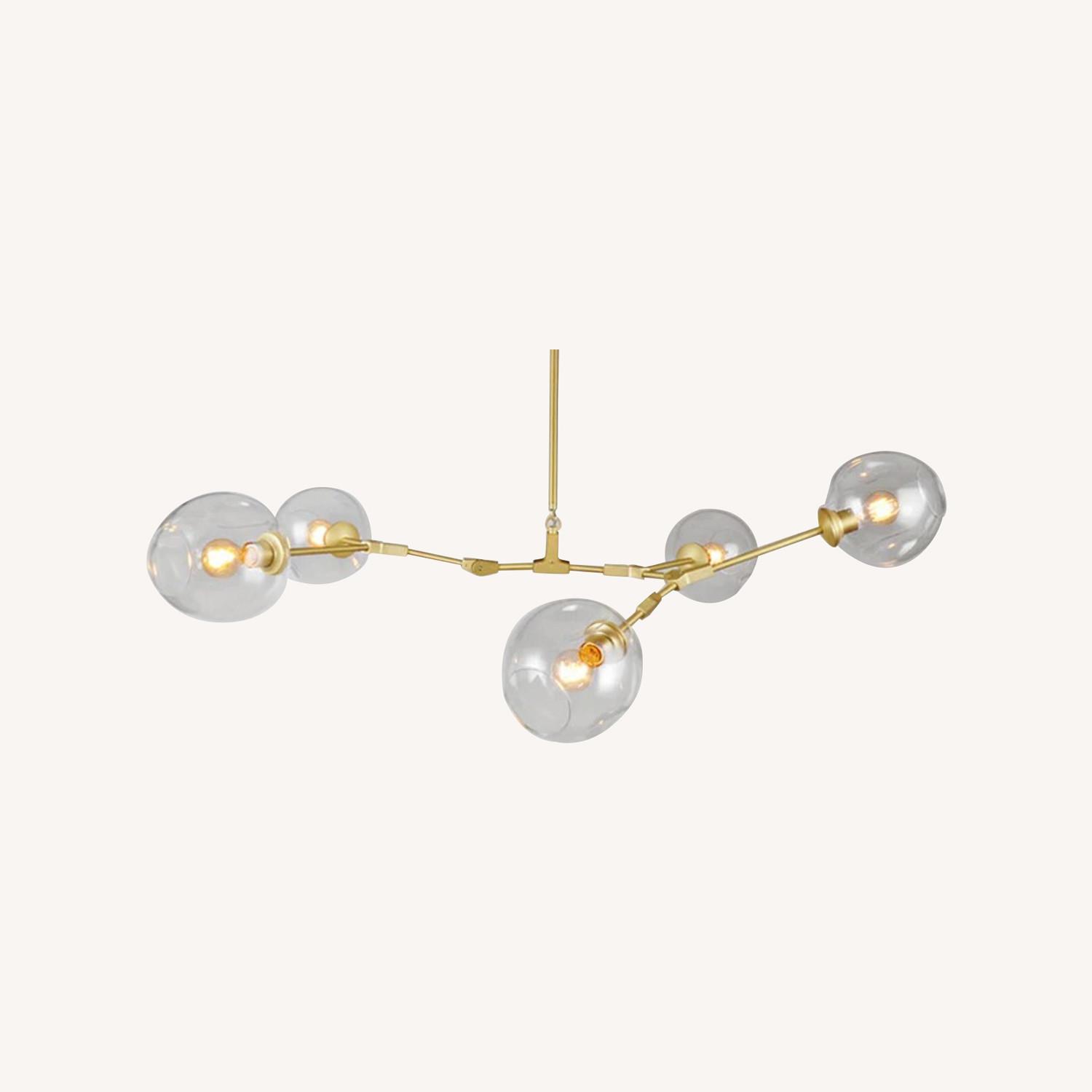 Seller's Notes:Lindsey Adelman 5-Globe Branching Bubble (Brushed Brass/Clear Glass) Description Excellent condition, original Lindsey Adelman 5- Globe Branching Bubble. Well cared for. Only selling because we re-designed our dining area. Brushed brass/ clear glass. Here is the link to the tear sheet: https://firebasestorage.googleapis.com/v0/b/laswebsite-39350.appspot.com/o/PDF%2F210707%2FBB.05.28%20Tear%20Sheet.pdf?alt=media&token=4e64f213-0075-456e-8cb4-7125380cc09d SpecificationsDIMENSIONS H 21in / 53cm W 64in / 163cm D 21in / 53cm WT 20lb / 9kg MATERIALS Machined Brass Glass SUSPENSION Includes 36” or 72” stem that can be cut on-site. Longer lengths available upon request. CANOPY Ø5" x H.25" Canopy From the designer's website: Branching Bubble is the union of those two seemingly disparate aesthetics—the industrial and the organic—like a marriage of opposites gone crazy with joy. The fixture can stay simple, or it can be designed to wander or sprawl to fit the space. Available in a range of metals and finishes, it can punctuate a vast ceiling with its warm glow or trickle down a wall—the possibilities are endless. The glass globes, whether clear, white or smoky gray, are like delicate vases set just slightly askew. The natural imperfections make the chandelier feel almost alive.