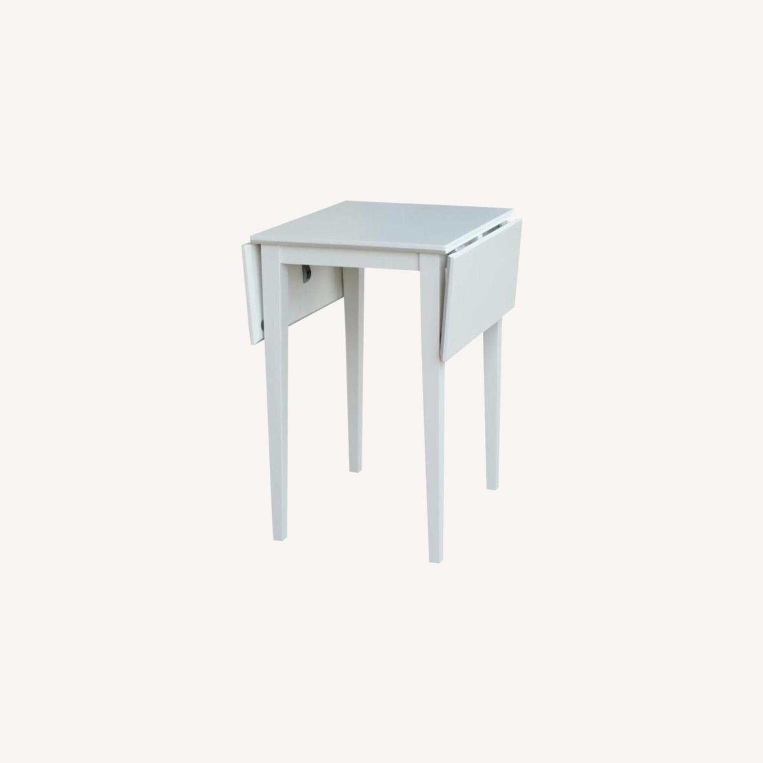 Seller's Notes:Home Depot by International Concepts: Linen White Drop Leaf Extendable Dining Table. Measurements: Length - 36" completely extended; 18" with folded wings; Width - 22"; Height - 29". In very good condition.